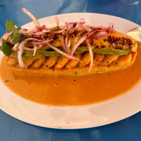 Salsa especial, aguacate,manteuilla,cilantro, camaron