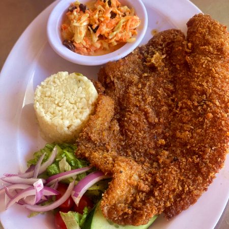 Filete empanizado acompañado de ensala dulce, ensalada fresca y sopa de arroz.