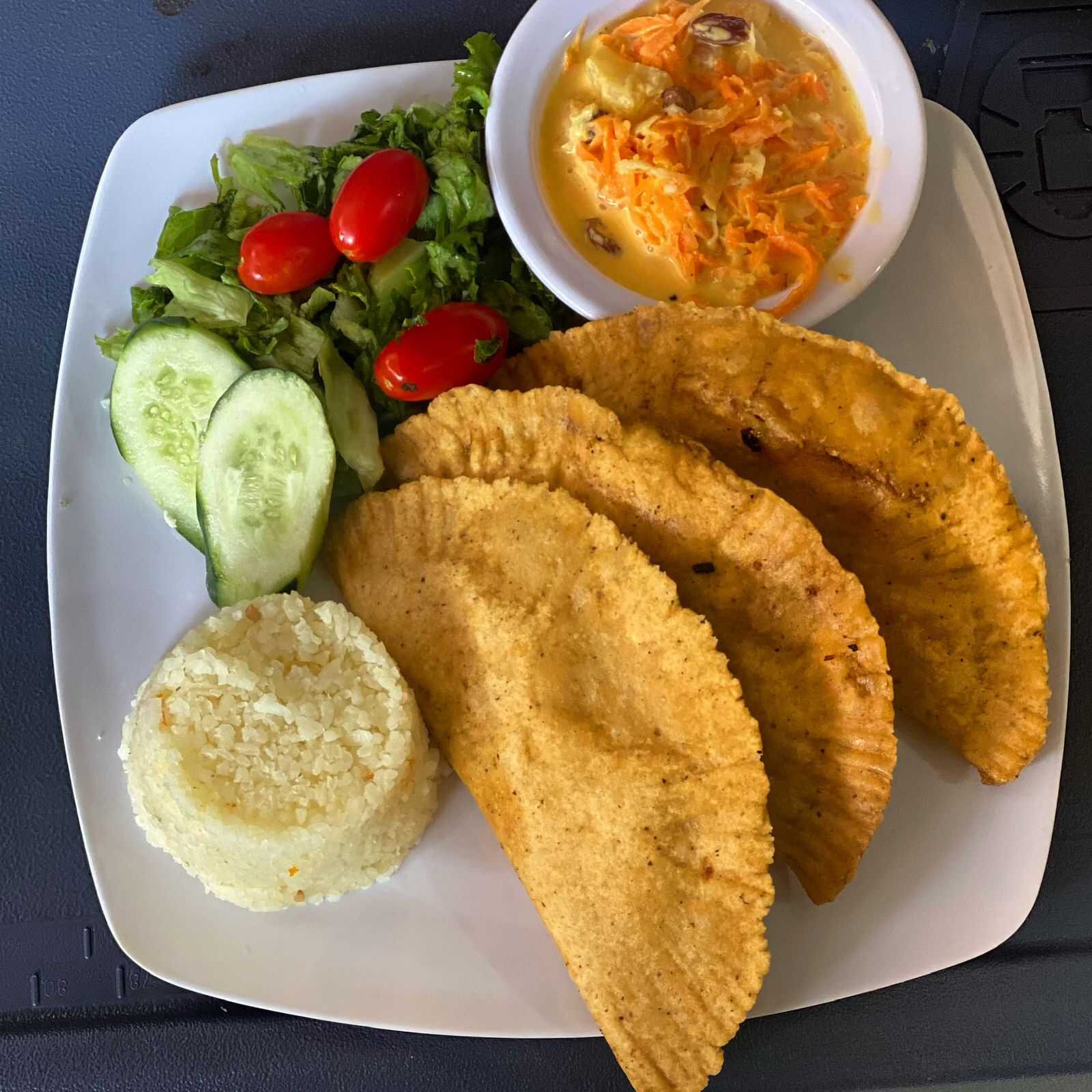 Empanadas rellenas de queso y camaron guisado, acompañadas de ensalada dulce, ensalada fresca y sopa de arroz.