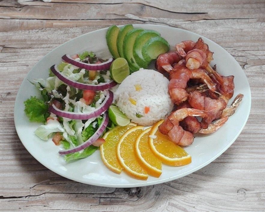 5 piezas de Camarones rellenos de queso mozarella y envueltos en tocino, guarnición de ensalada de lechugas, jitomate, cebolla, aderezo, pepino, zanahoria aguacate y arroz blanco