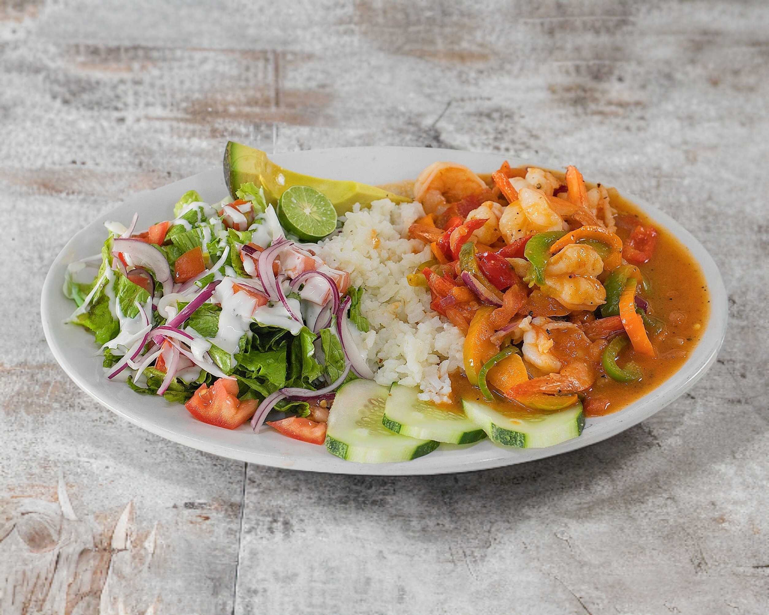 Camarones en salsa de chiles morrones jitomate cebolla y cerveza clara, guarnición de ensalada de lechuga, jitomate, cebolla, pepino, aderezo, zanahoria y arroz blanco.