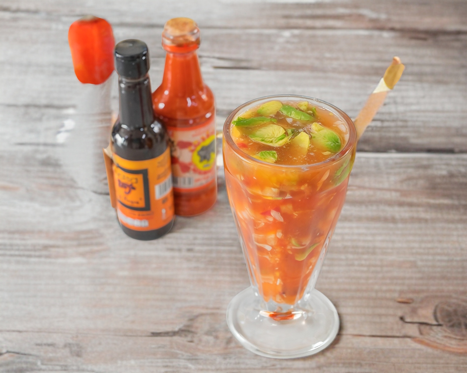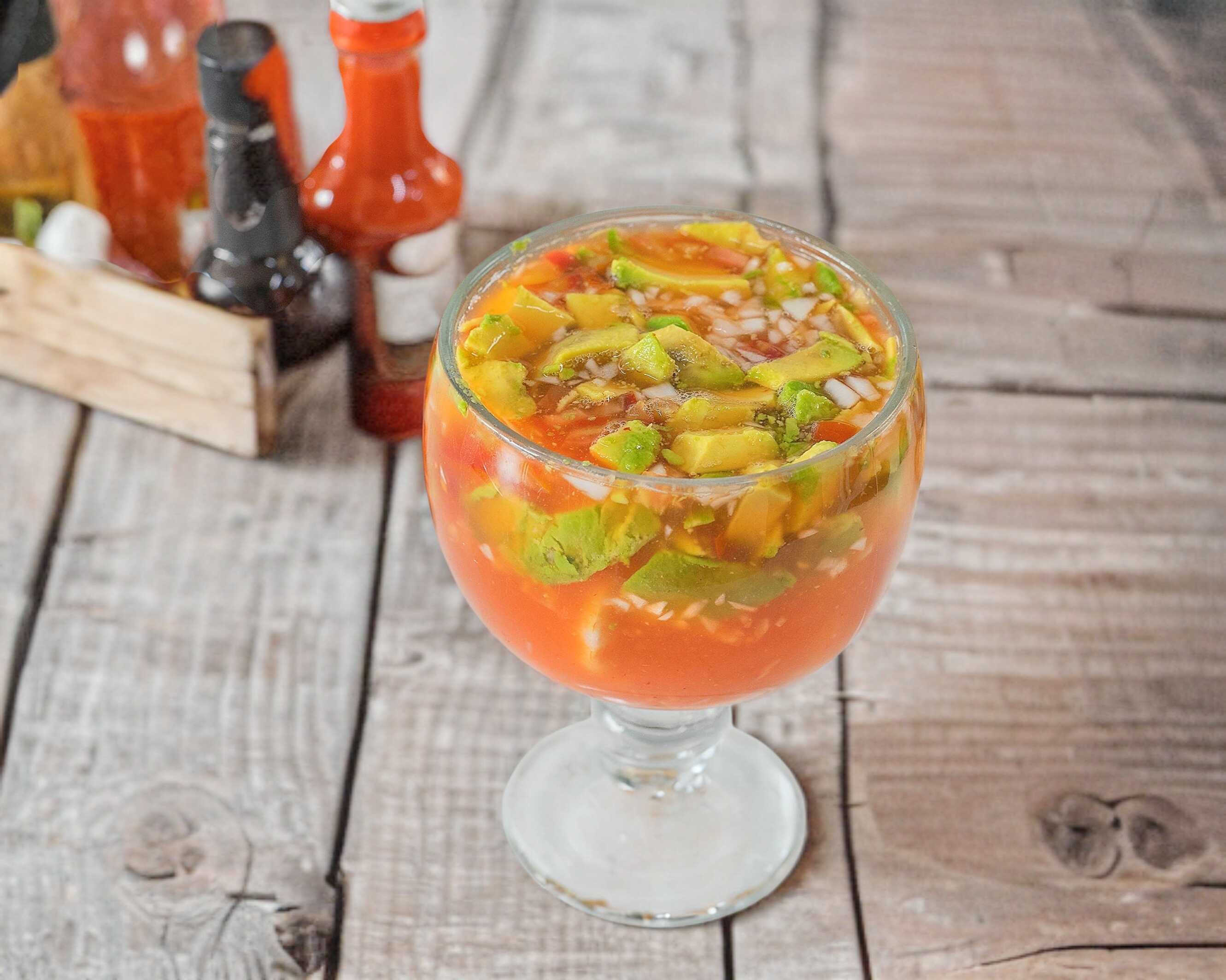 1Lt con Tus mariscos favoritos, caldo de camarón, cátsup, jitomate, cebolla, aguacate y limón, acompañado de 4 tostadas y 2 galletas saladitas.