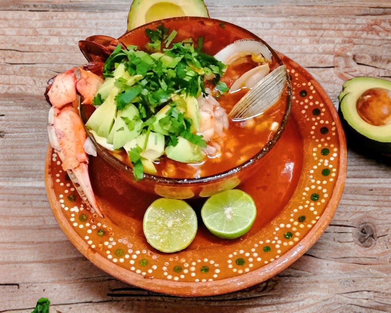 Caldo con camarón, pulpo, mantarraya, pescado, almeja, zanahoria y chayote.