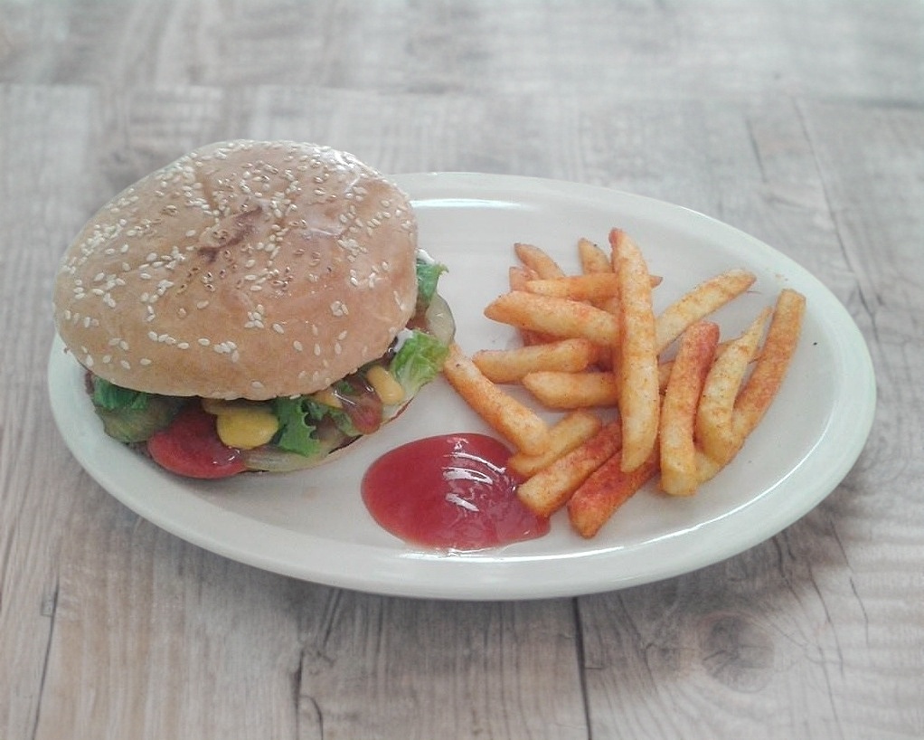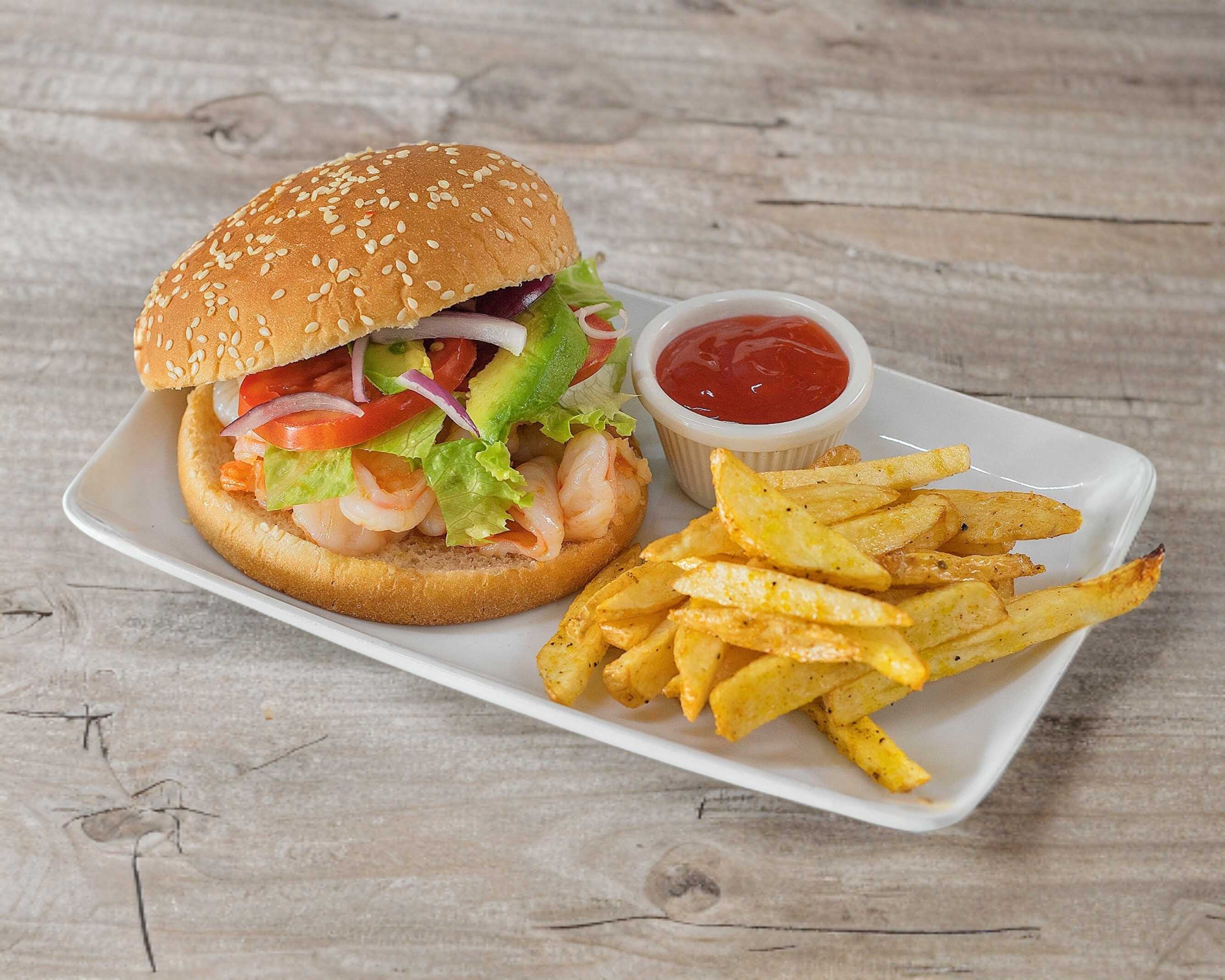 5 camarones grandes servidos en pan de hamburguesa con jitomate, cebolla, aguacate y aderezos, acompañado de papas fritas.