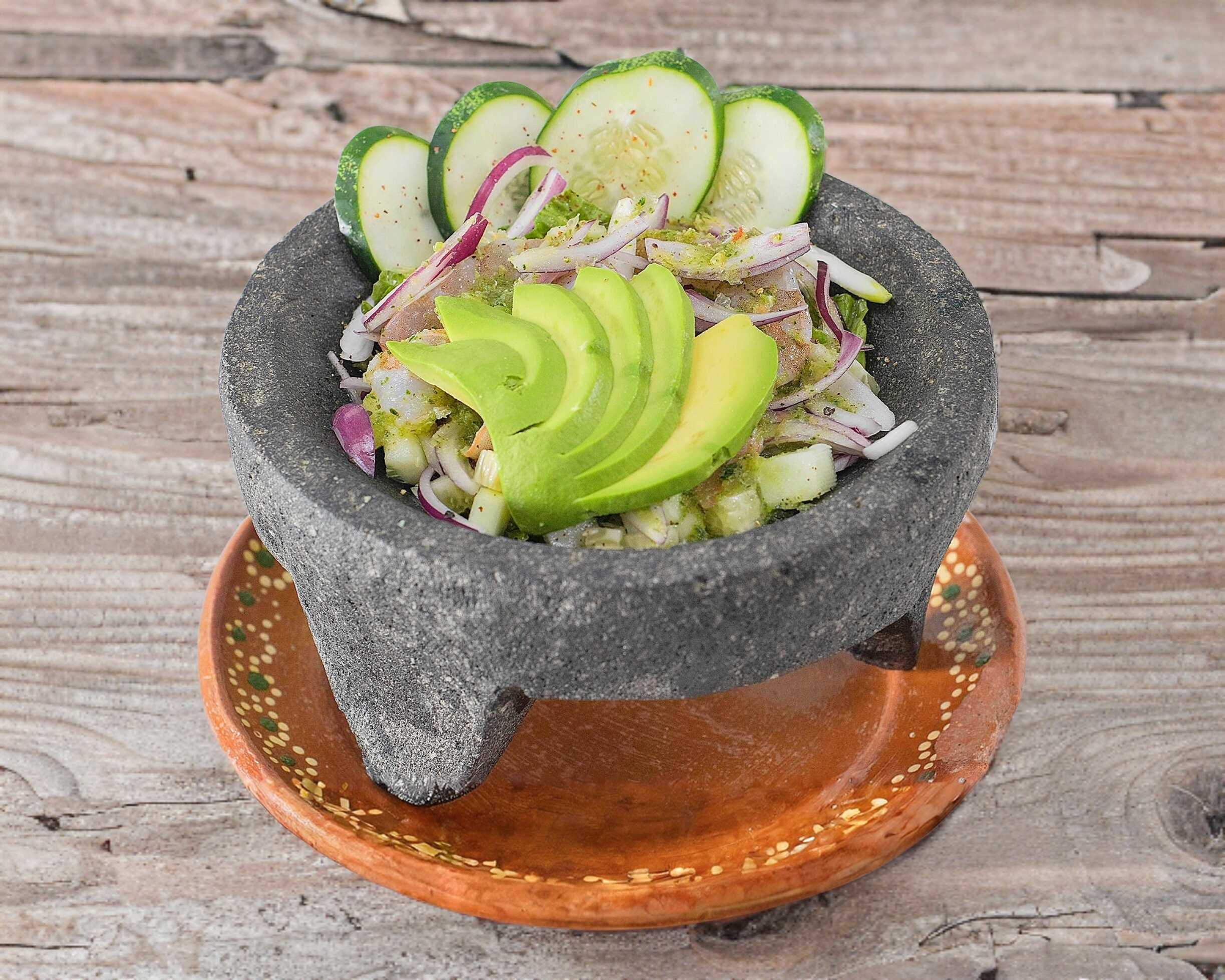 Camarones cocidos en limón, bañados en una salsa de chile de árbol, pepino, cebolla y aguacate.