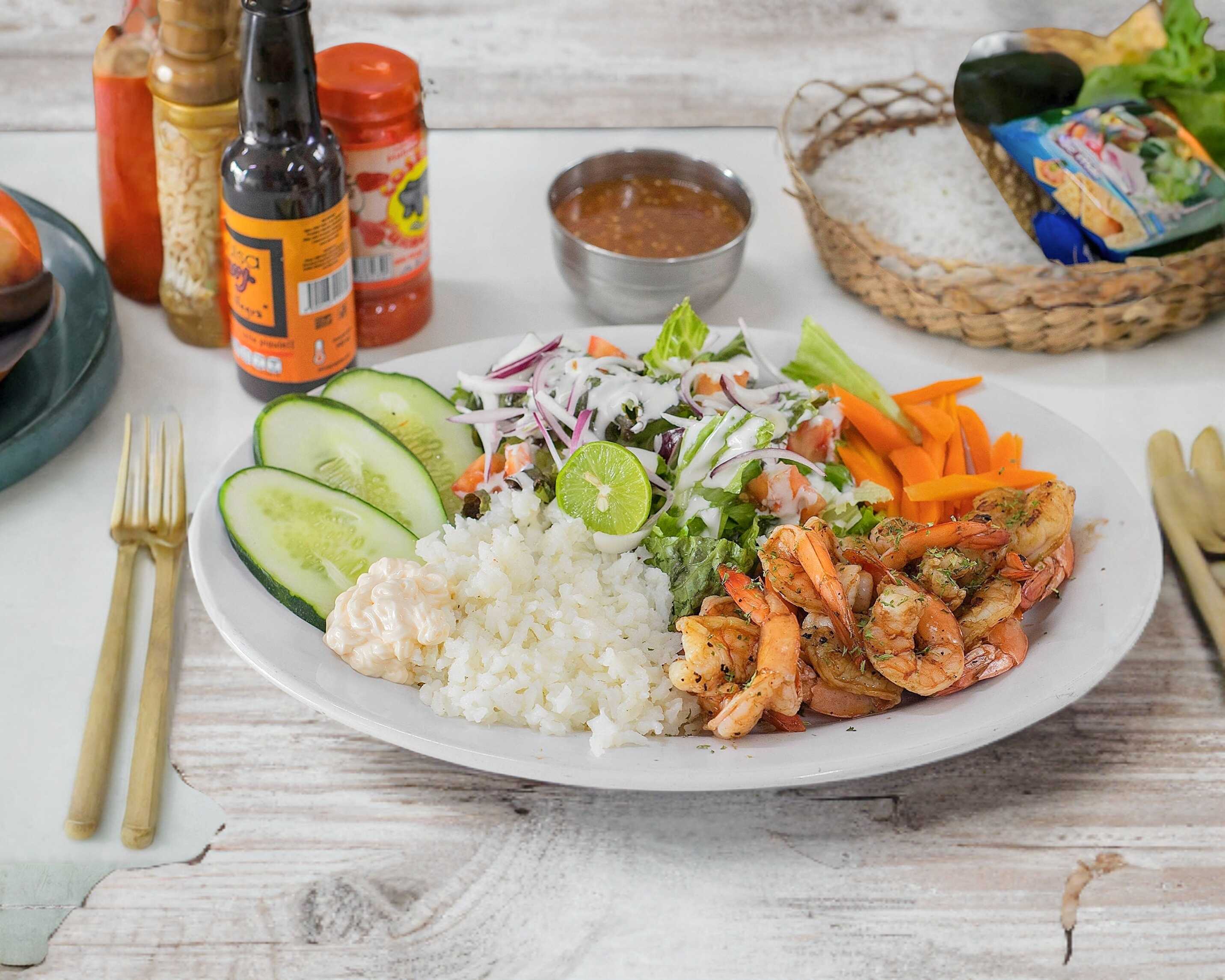 Arroz blanco con 5 camarones a plancha zanahoria, aguacate, mayonesa y cátsup.