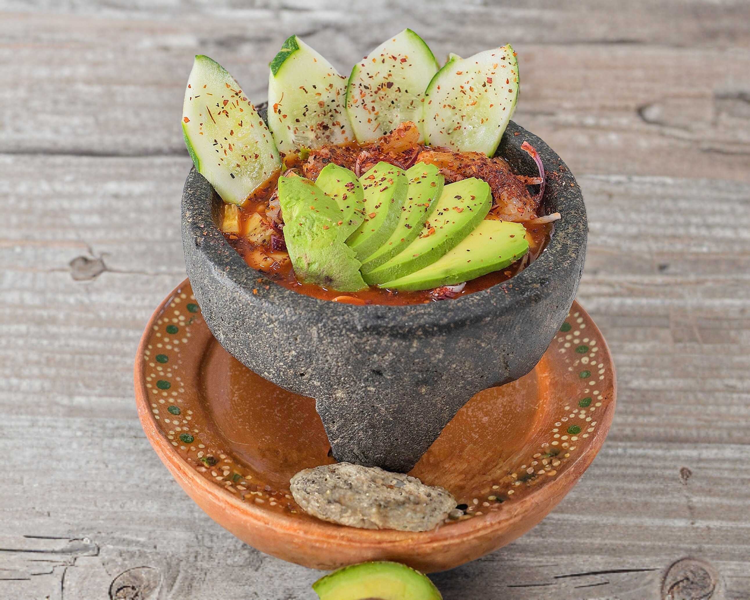 Camarones cocidos en limón, bañados en una salsa de chile serranos y servidos con pepino, cebolla y aguacate en rebanadas.