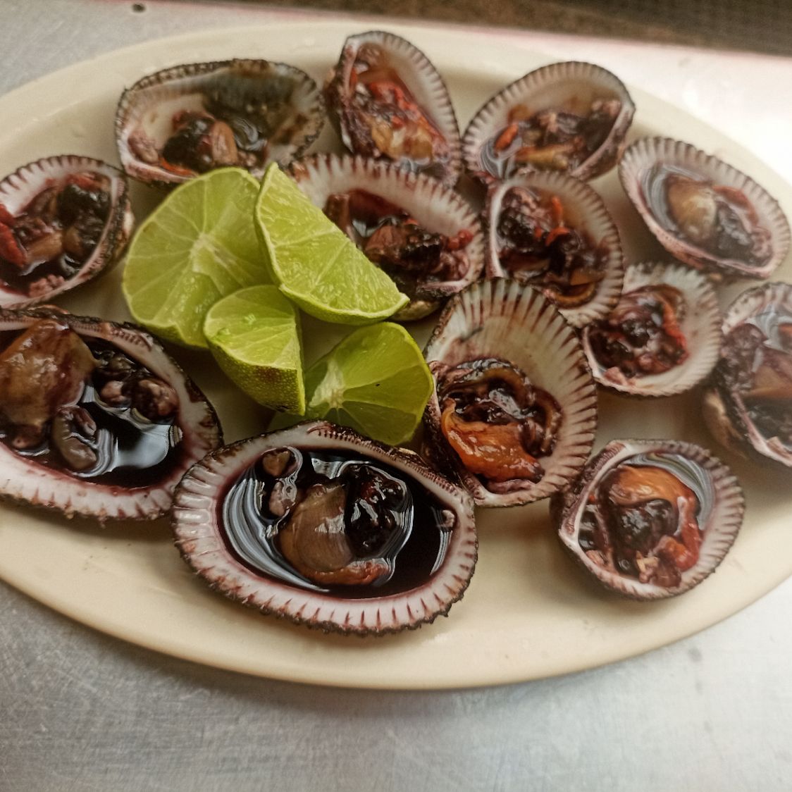 20 conchas de pata de mula, acompañado de limón y tostada.