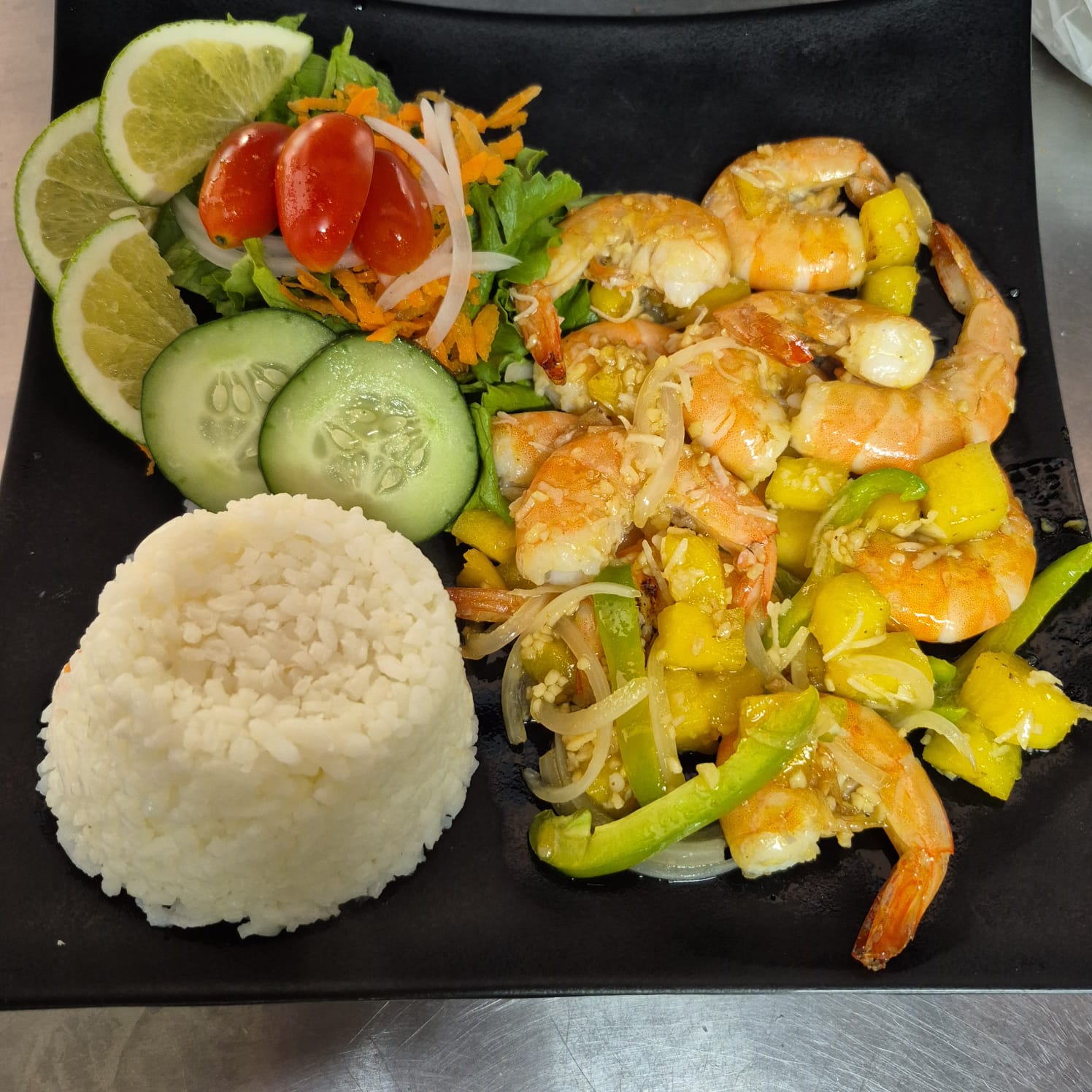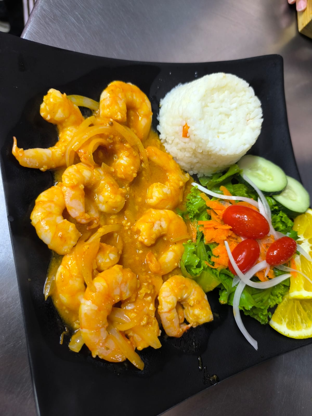 Camarones cocinados al estilo hawaiano, con piña, pimiento morrón, coco y un toque de miel y ron (acompañado de arroz blanco y ensalada fresca).