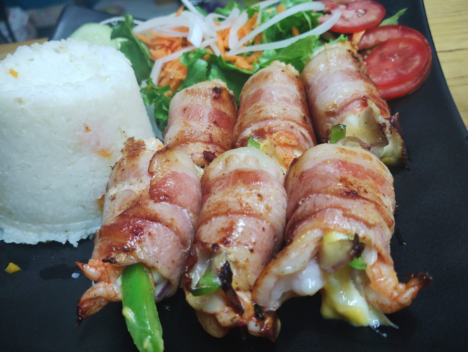 Camarones rellenos de mezcla de quesos, envueltos en tocino y cocinados a la plancha (acompañado de arroz blanco y ensalada fresca).