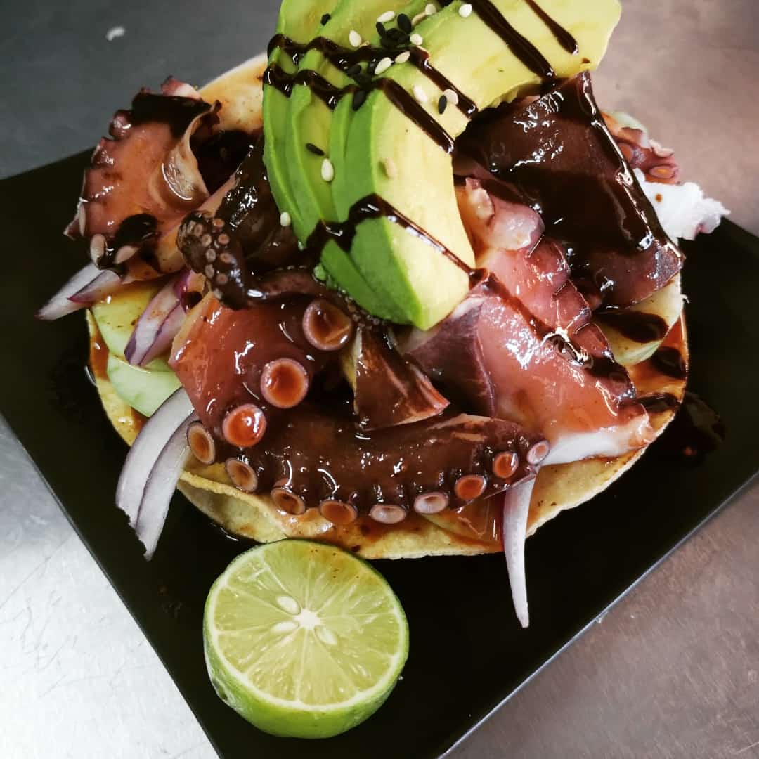 Ceviche de pulpo preparado al instante con verduras frescas coronado con aguacate y ajonjoli negro