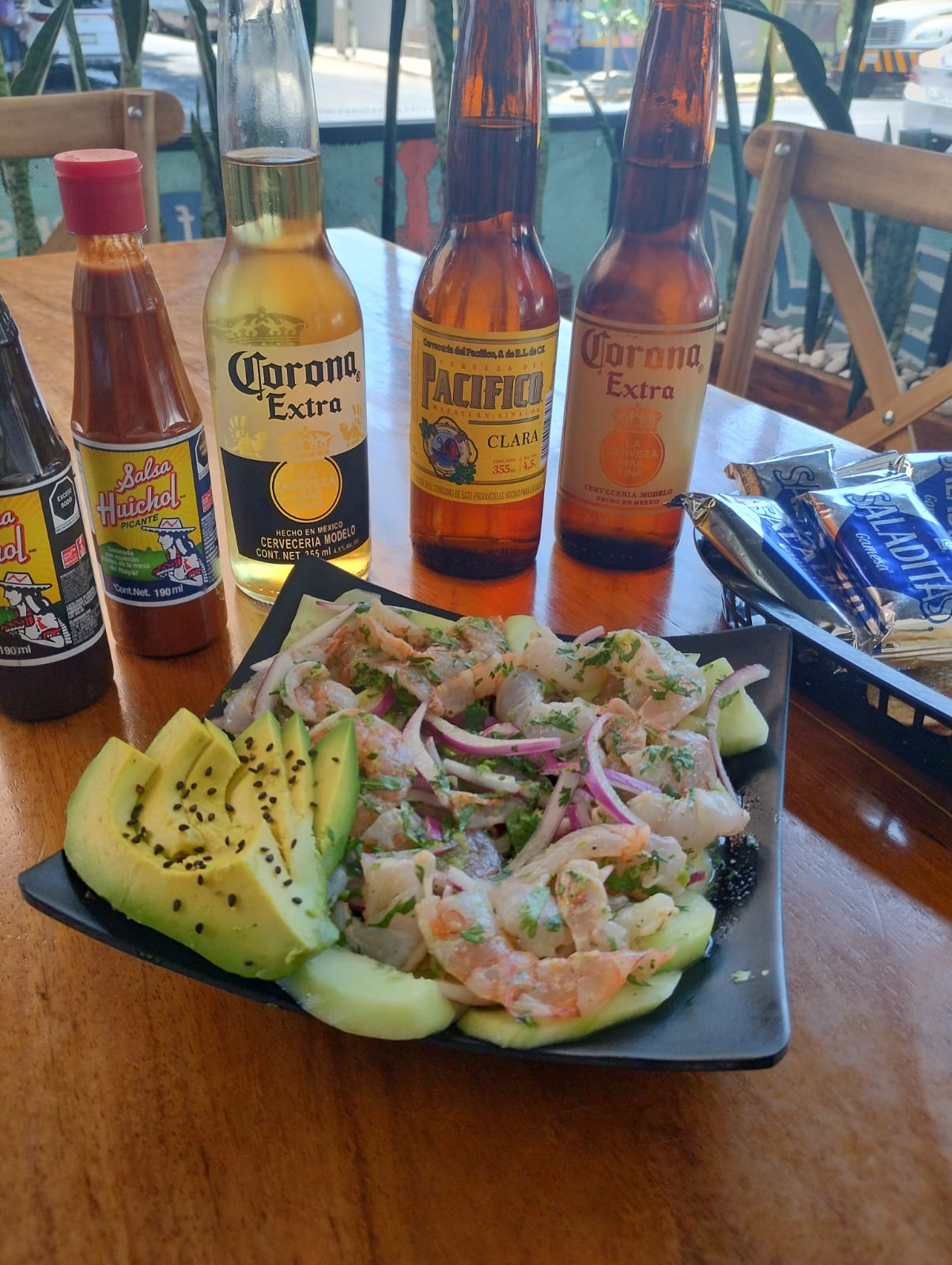 Ceviche de camarón cocido preparado al instante con verduras frescas coronado con aguacate y ajonjoli negro