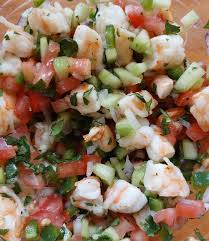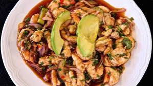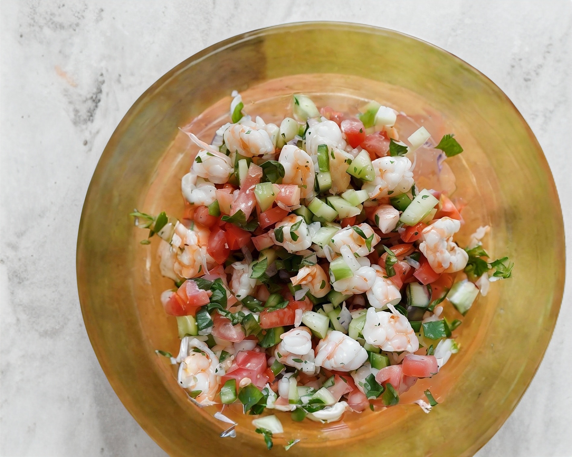 Camarón cocido en limón con jitomate, cebolla, cilantro y pepino, refrescante y sabroso.