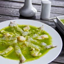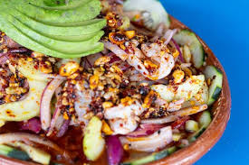 Camarón marinado en limón con chile, pepino, cebolla fresco y picante.