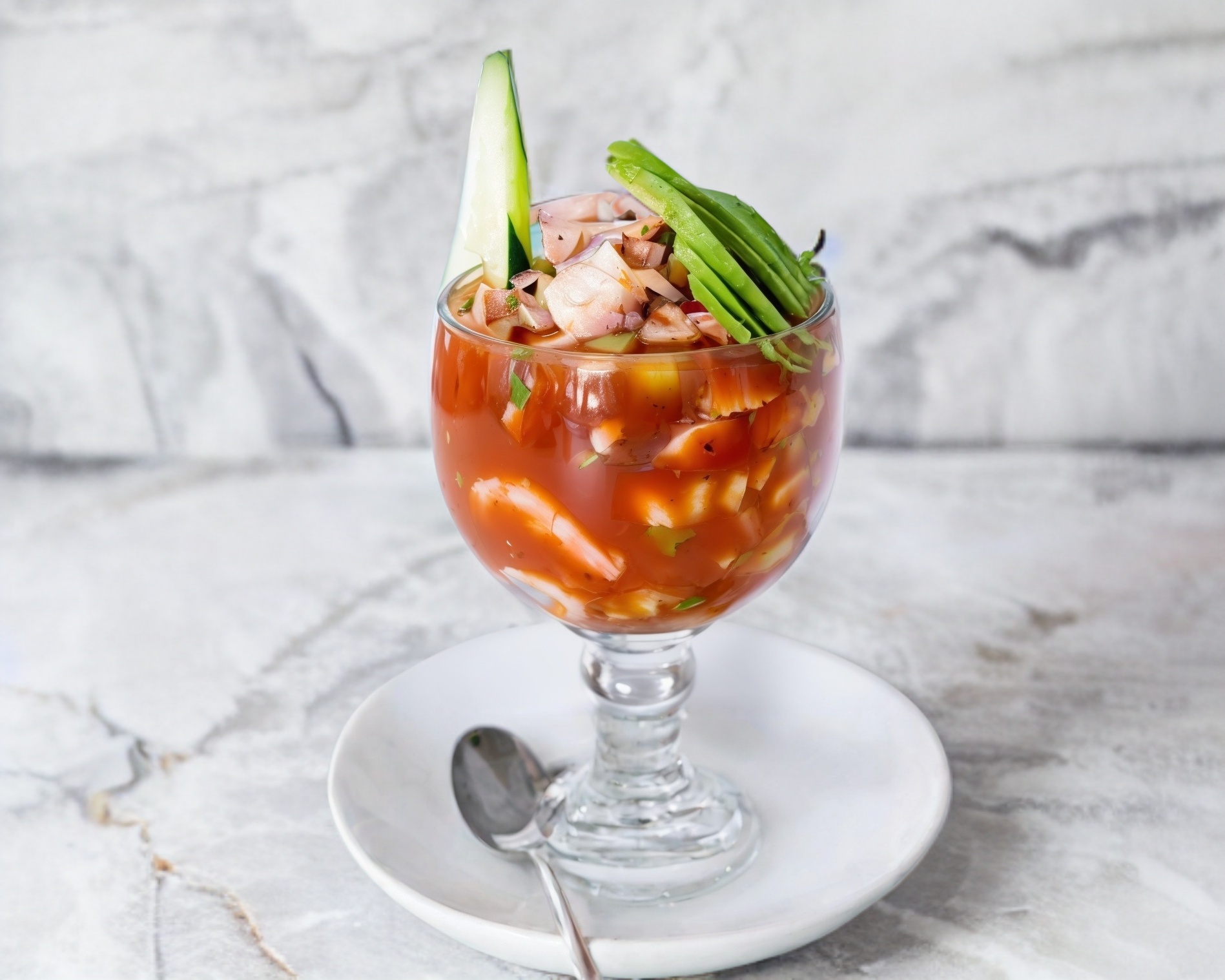 Mezcla de mariscos en salsa tipo clamato con jitomate, cebolla, pepino y limón, fresco y lleno de sabor.