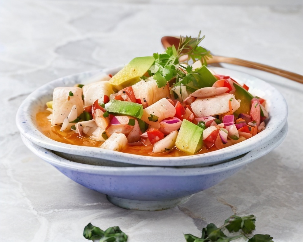 Pescado marinado en limón con jitomate, cebolla, pepino y cilantro, ligero y delicioso.