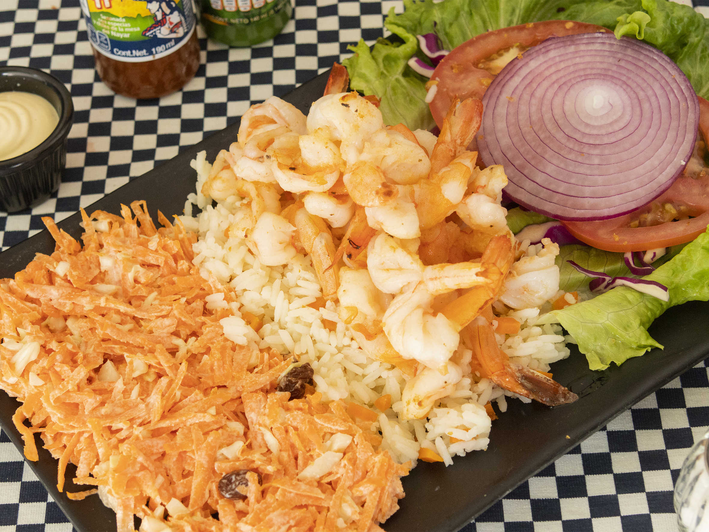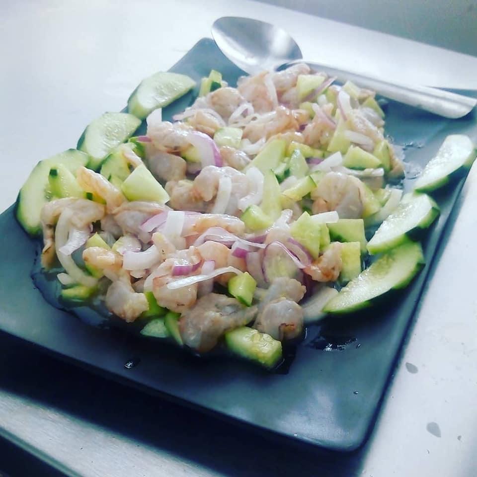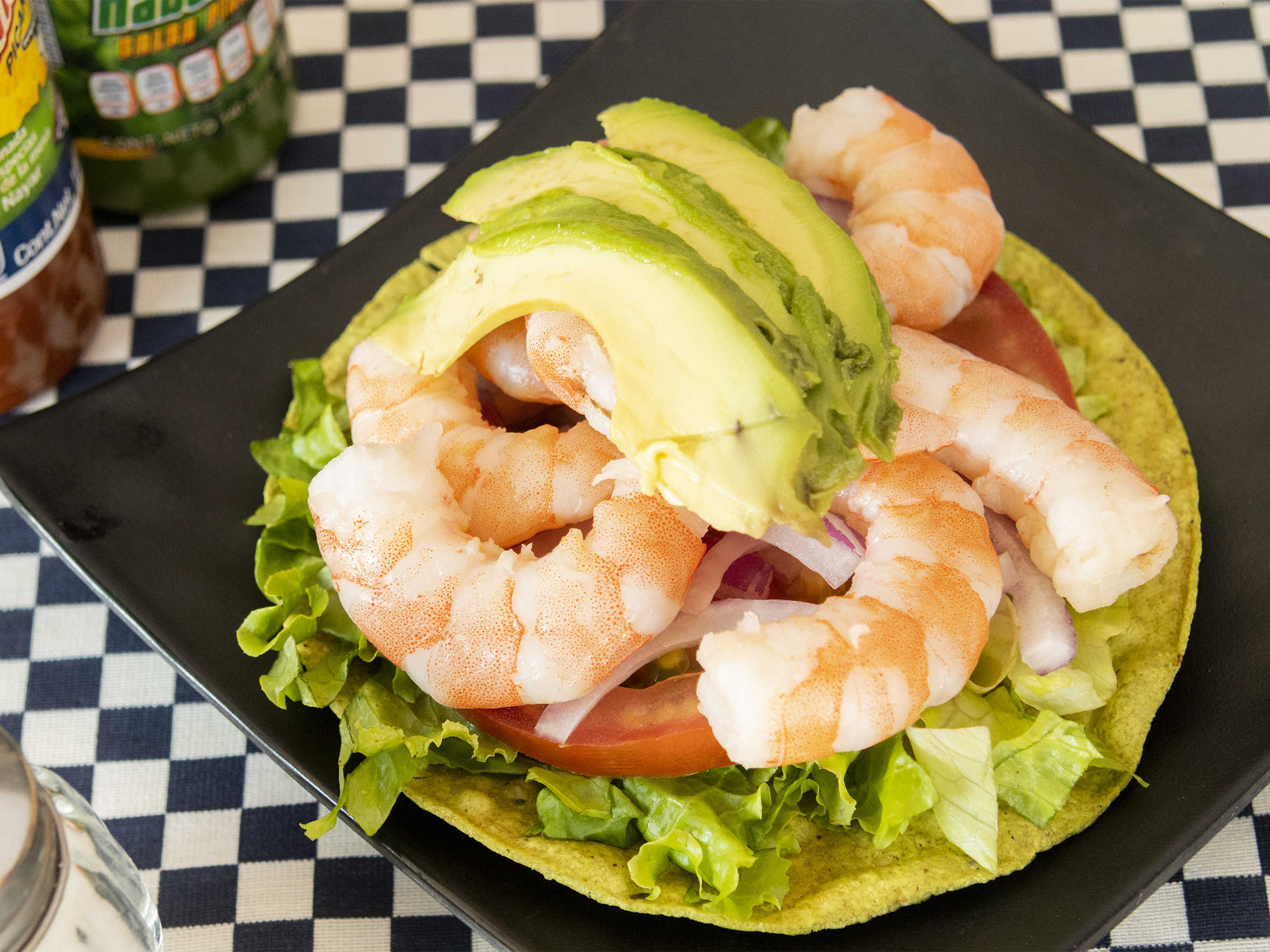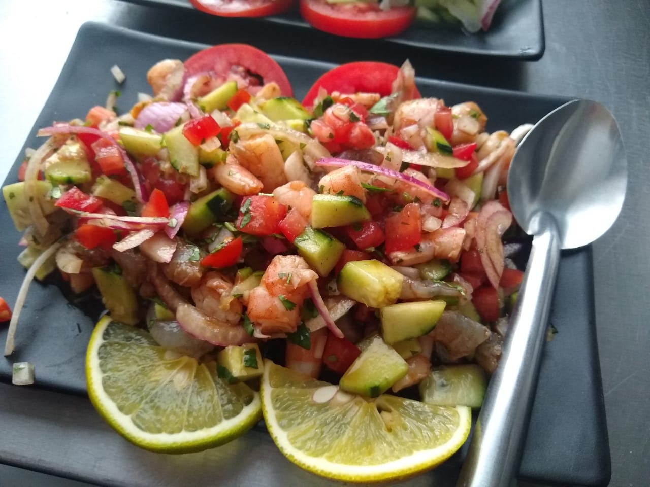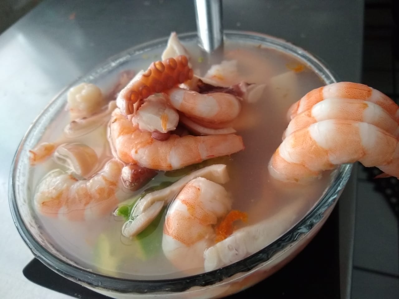 Caldo de camarón con jitomate, cebolla, aguacate, chile, catsup y limon