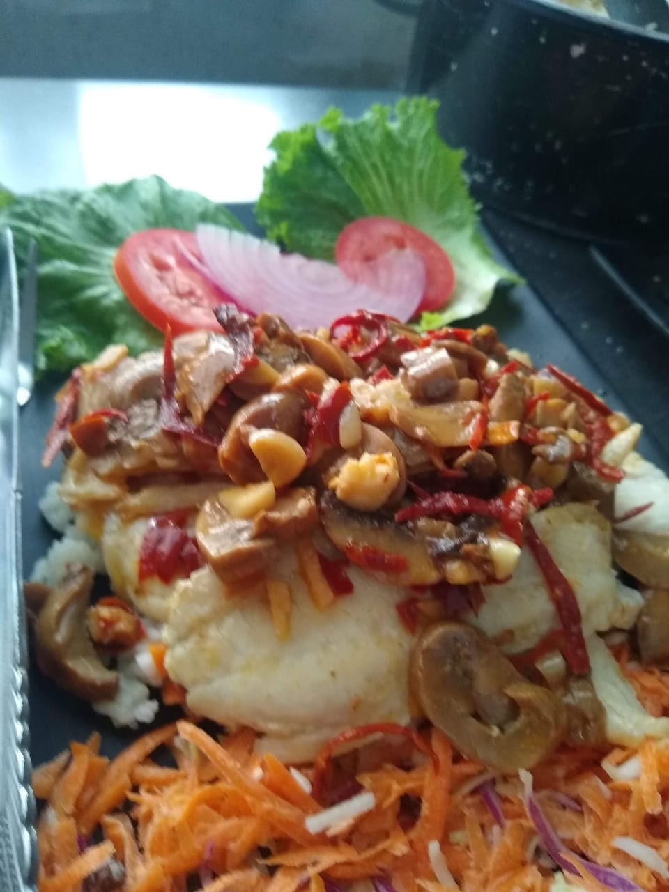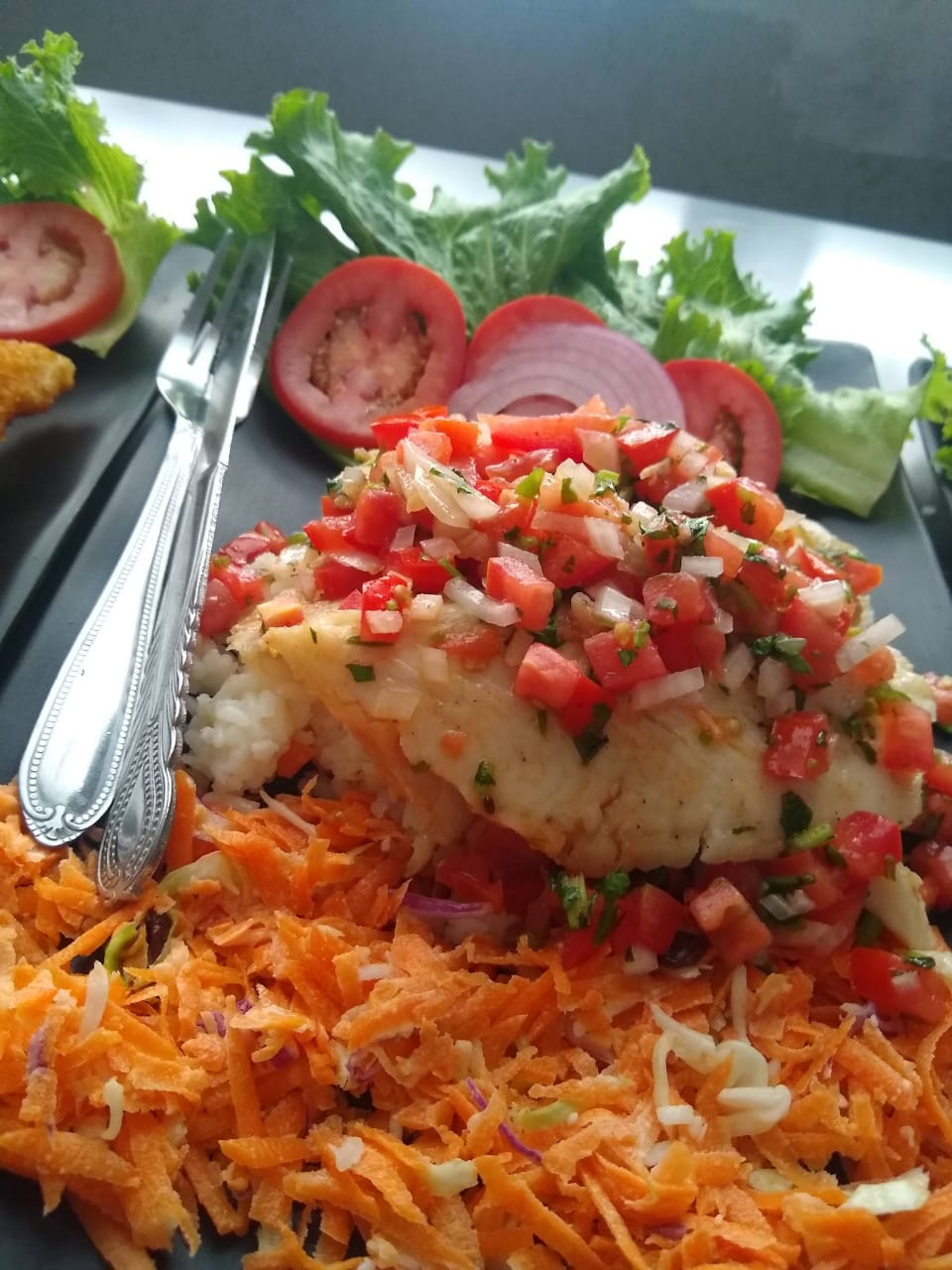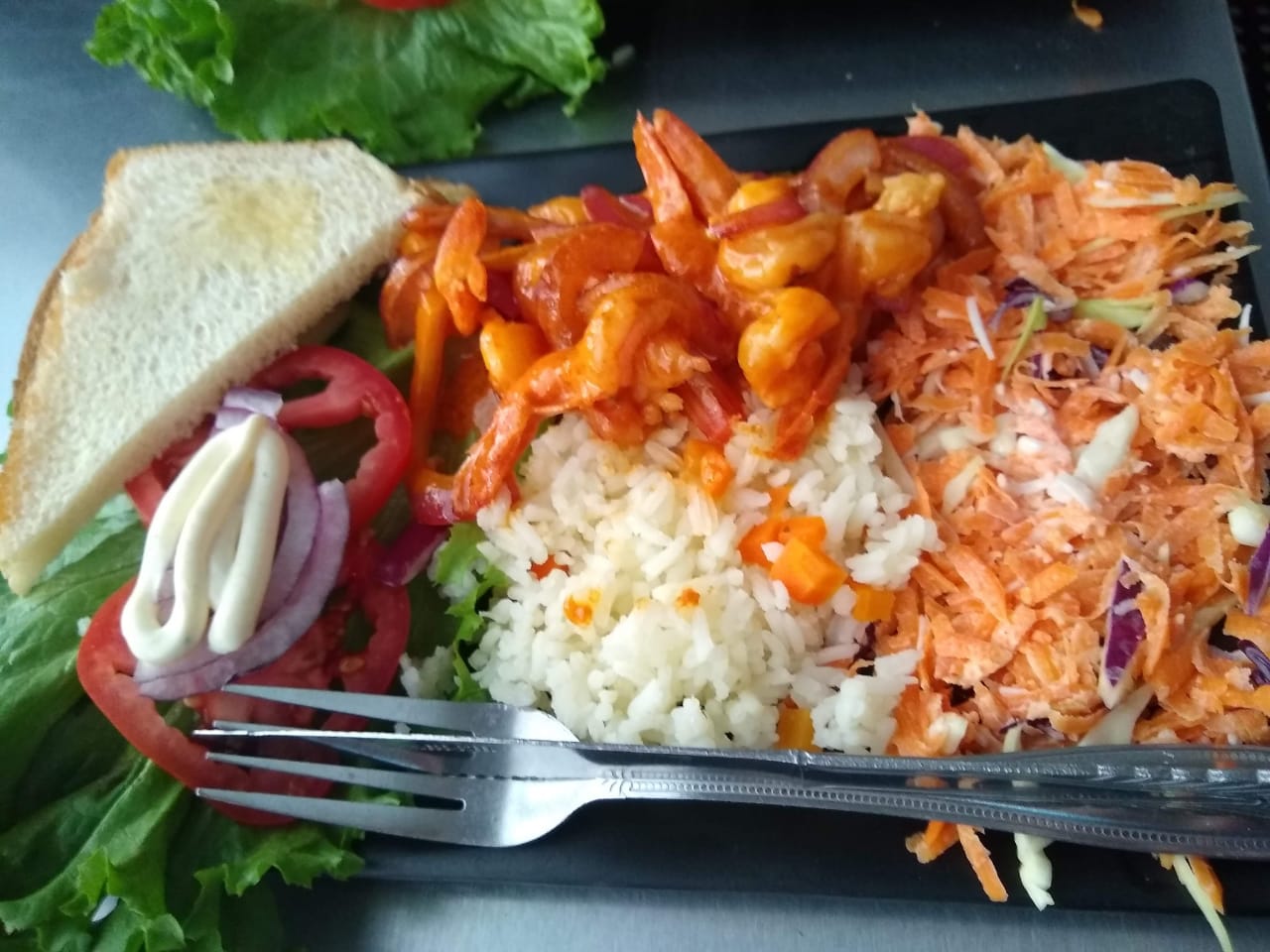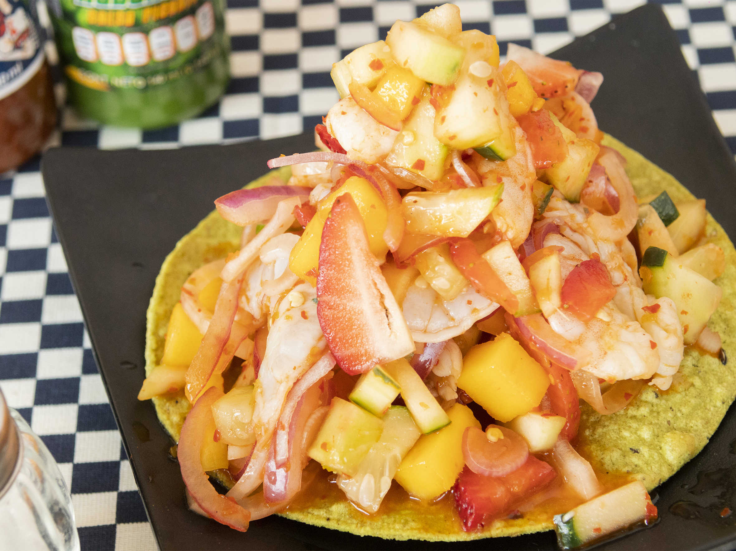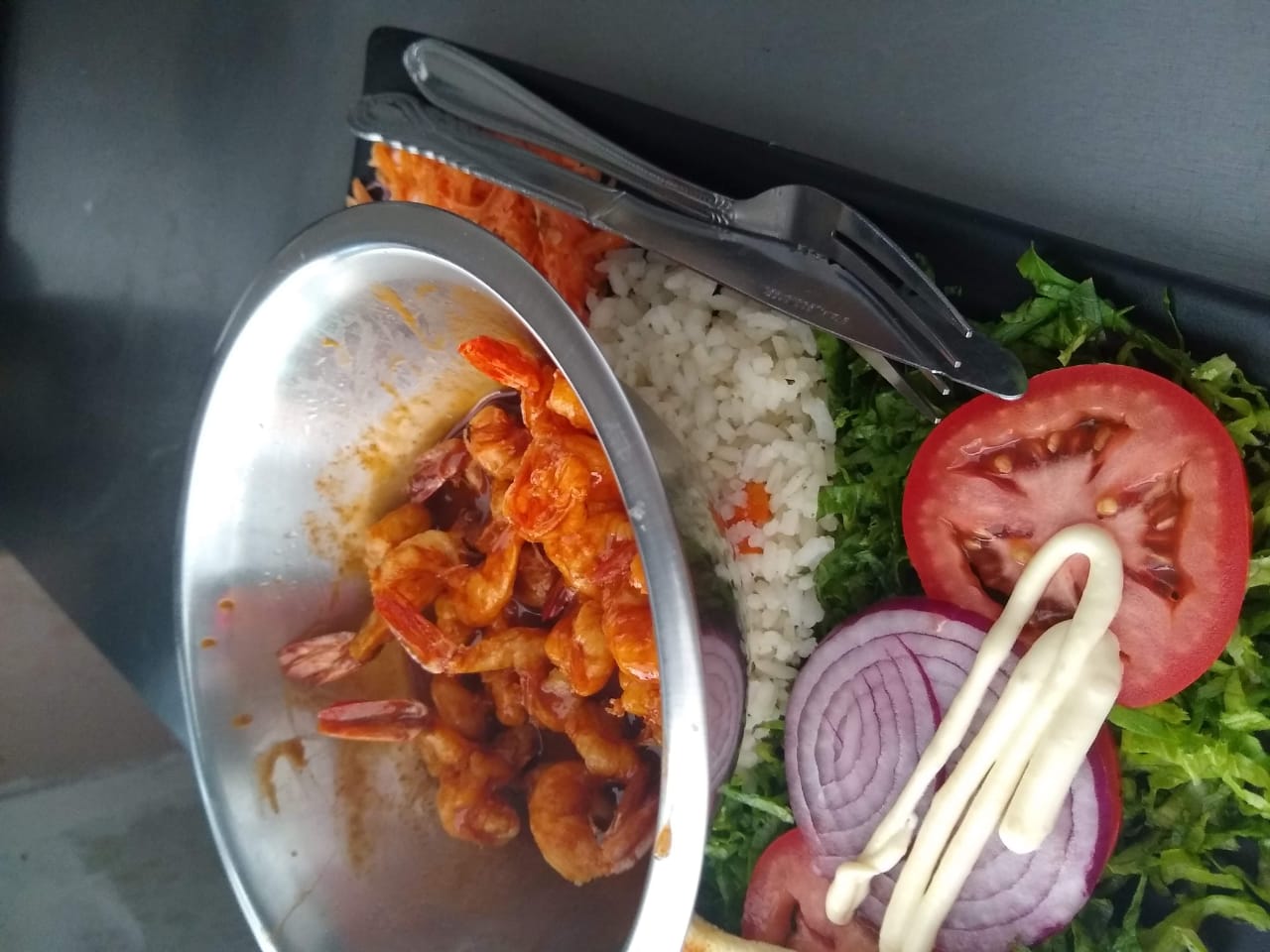 Caldo de camarón con jitomate, cebolla, aguacate, chile, catsup y limon