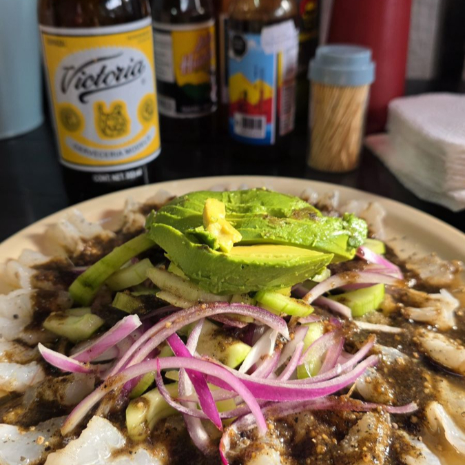 Pescado fresco marinado en limón con jitomate, cebolla y cilantro.
