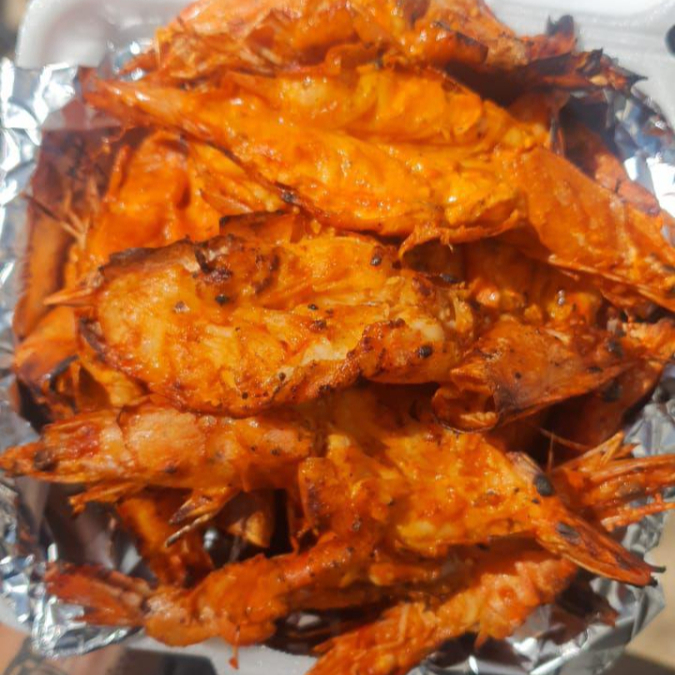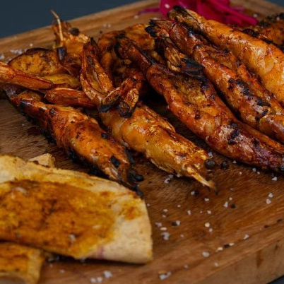 Camarones asados a la parrilla con adobo especial y toque ahumado.