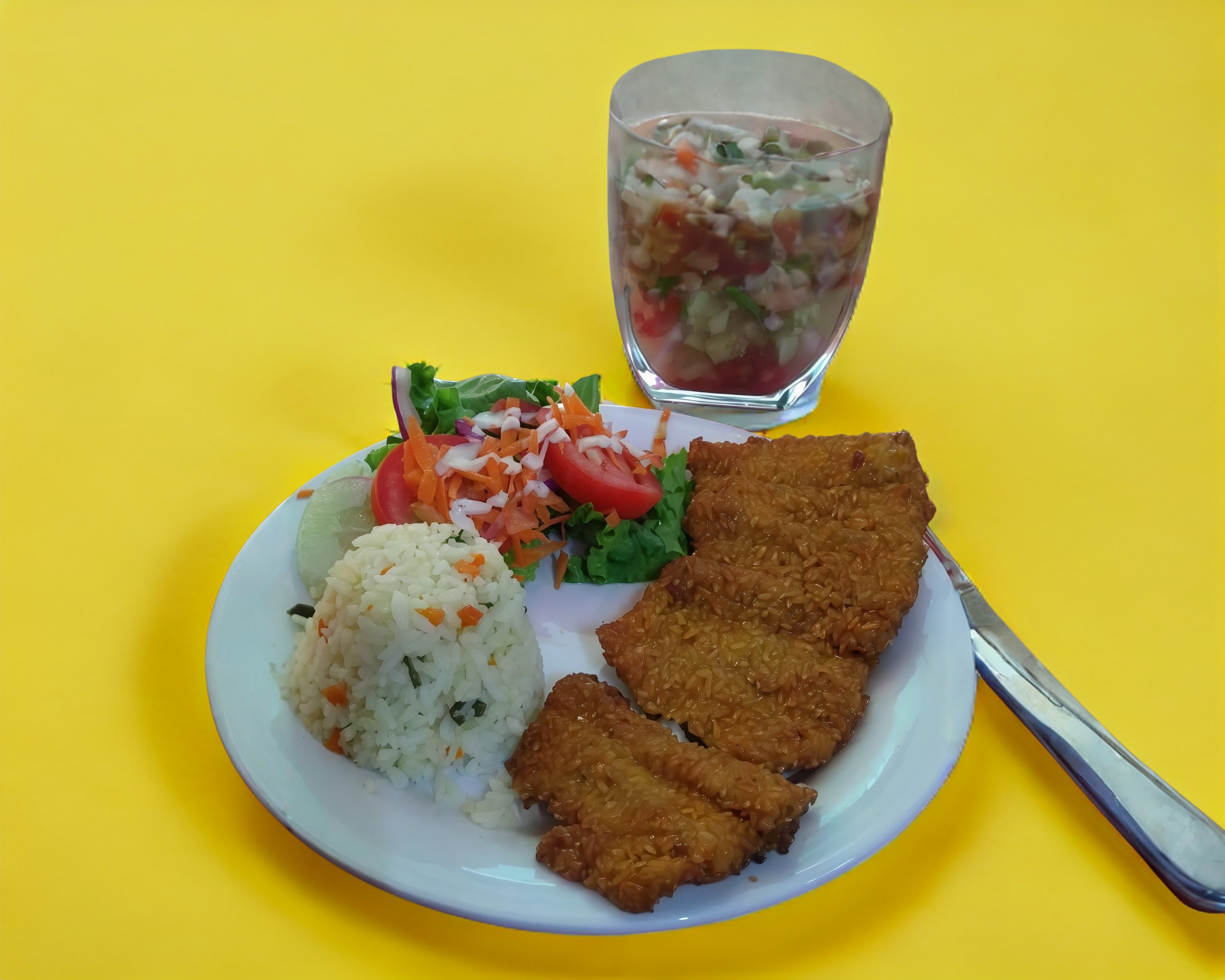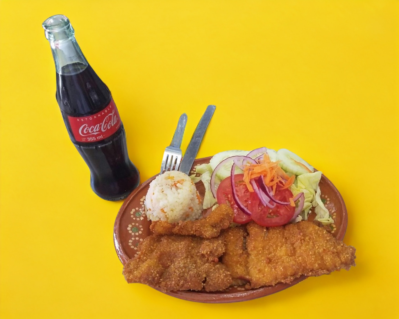 Exquisito filete de cazón empanizado acompañado de arroz blanco y ensalada fresca