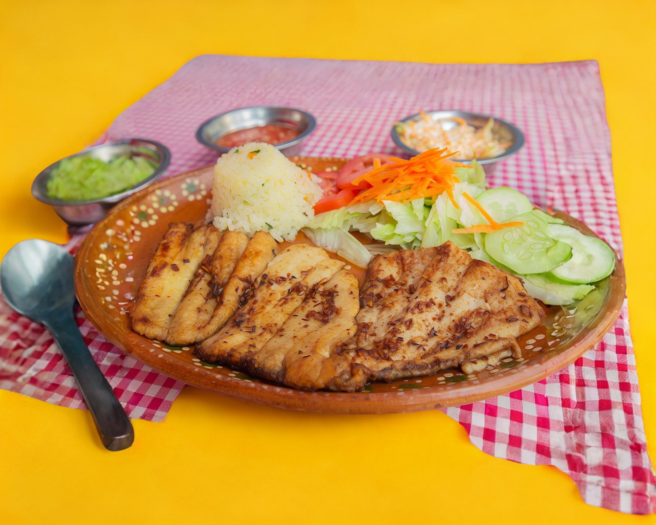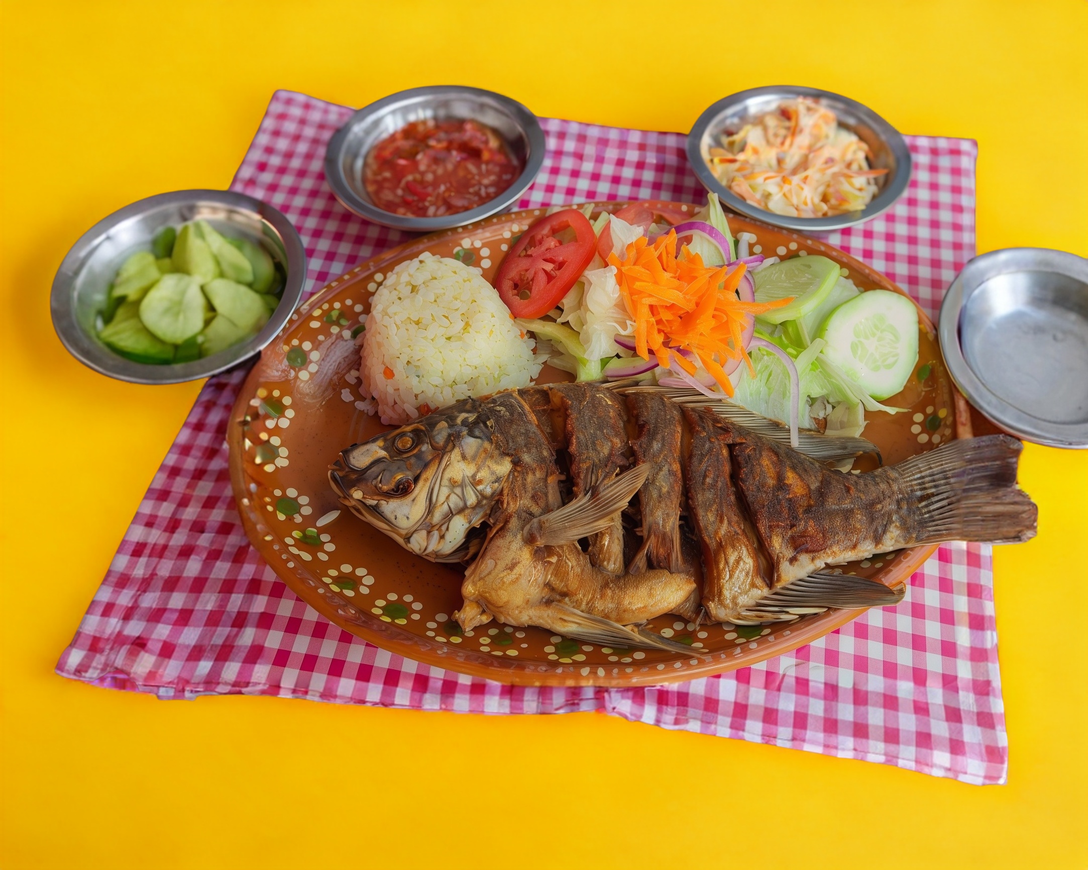 Exquisita mojarra dorada acompañada con tortillas, chile, aderezo, arroz blanco