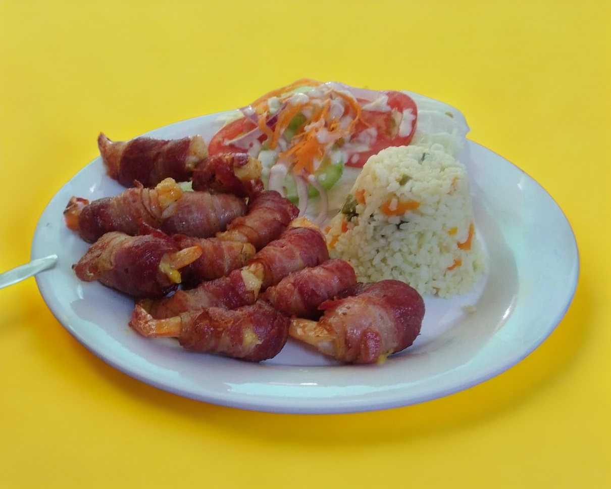 Exquisitos camarones rellenos de queso amarillo envueltos en tocino acompañados de arroz blanco y ensalada fresca