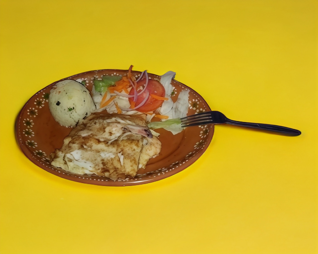 Filete de pescado (cazón) sazonado únicamente con sal pimienta acompañado de arroz blanco y ensalada fresca