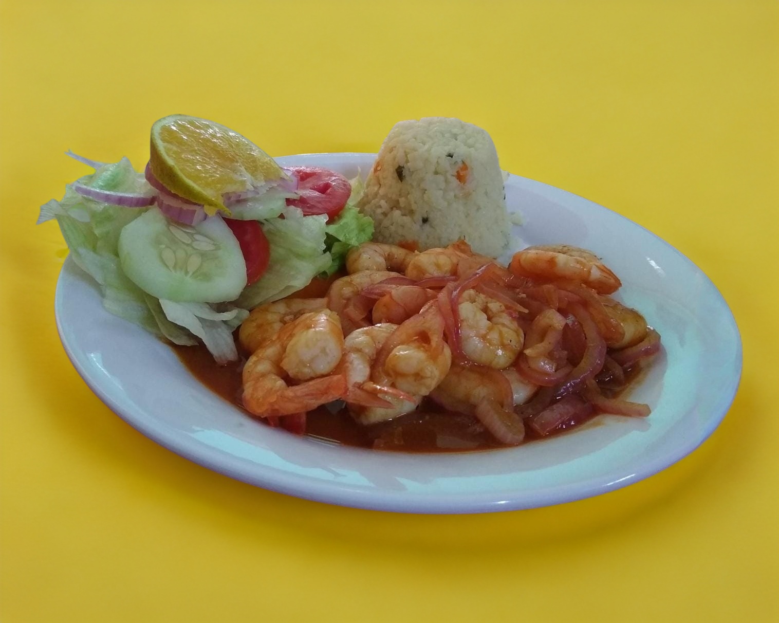 Picositos y jugosos camarones bañados en salsa diabla acompañados de arroz blanco y ensalada fresca