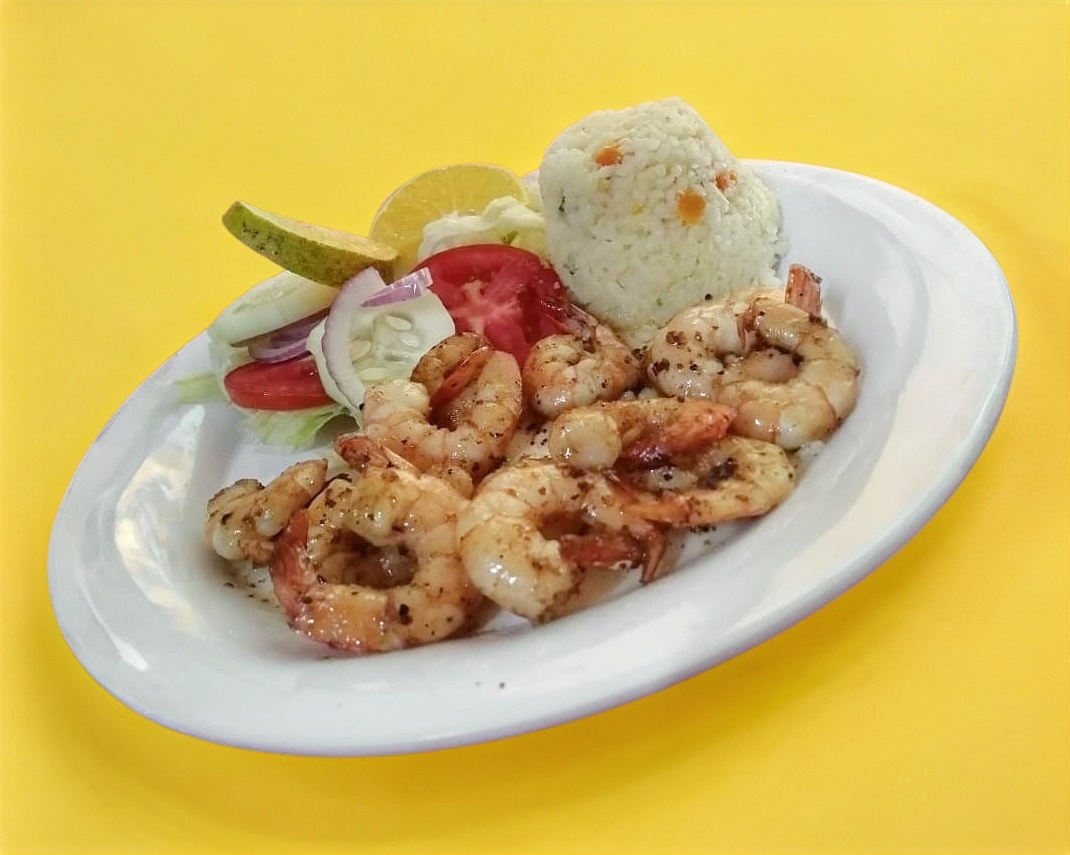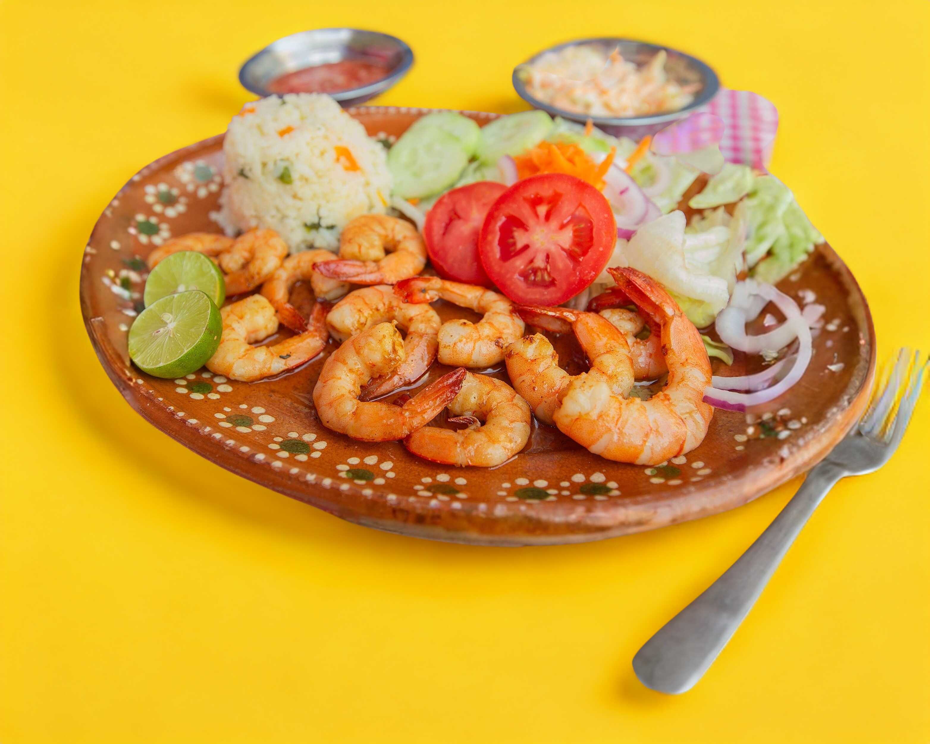 Jugosos camarones al vapor con un toque de huichol y limón acompado de arroz blanco y ensalada fresca