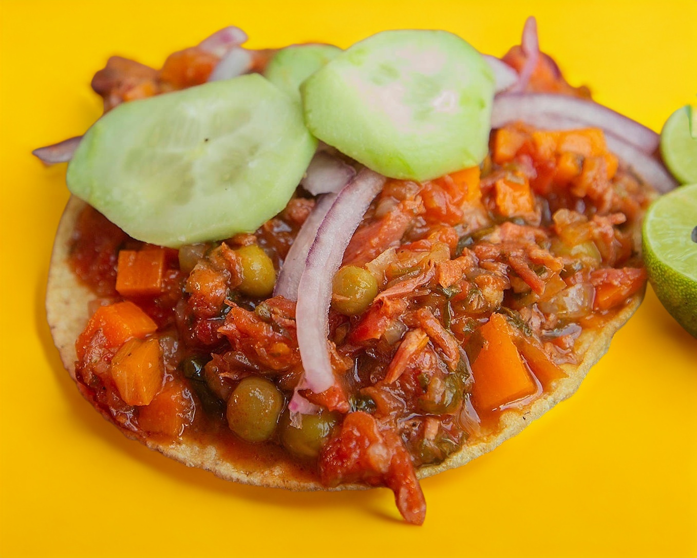 Tostada de Marlyn guisado con chicharos, zanahoria, jitomate y cebolla