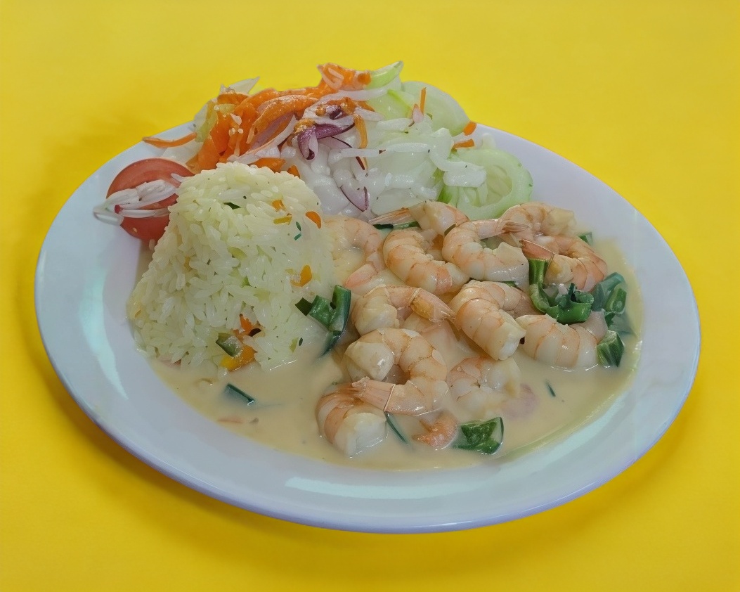 Exquisitos camarones flameados con tequila hechos a la crema con chile poblano, acompañado de arroz blanco y ensalada fresca