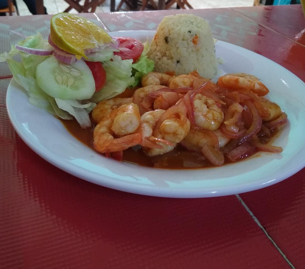 Deliciosos camarones guisados en ajo con aceite acompañados de arroz blanco y ensalada fresca
