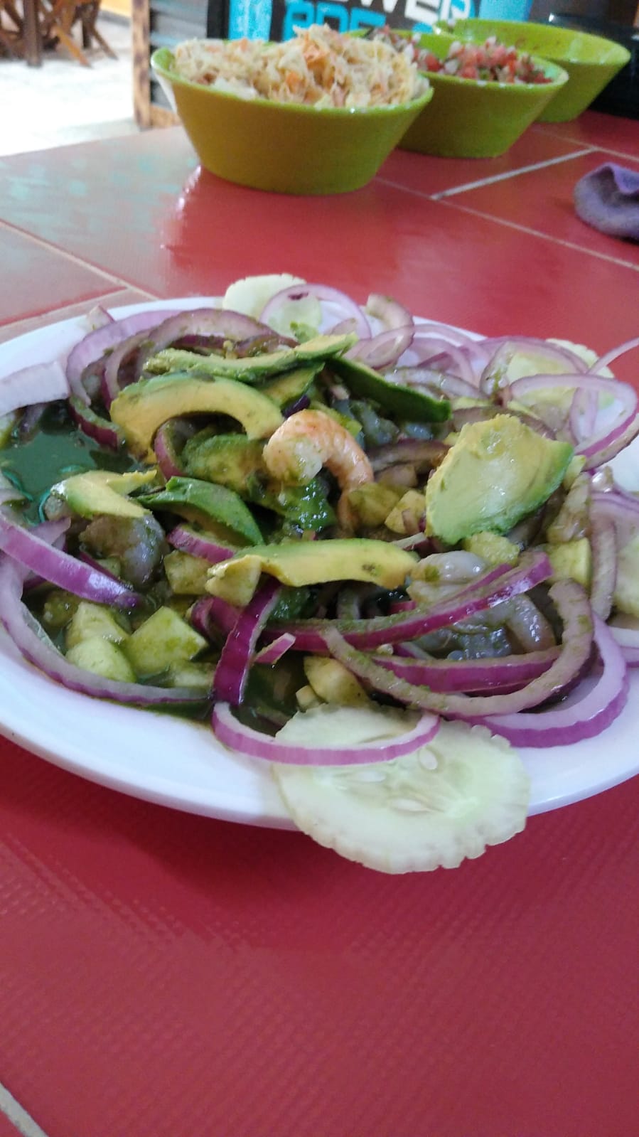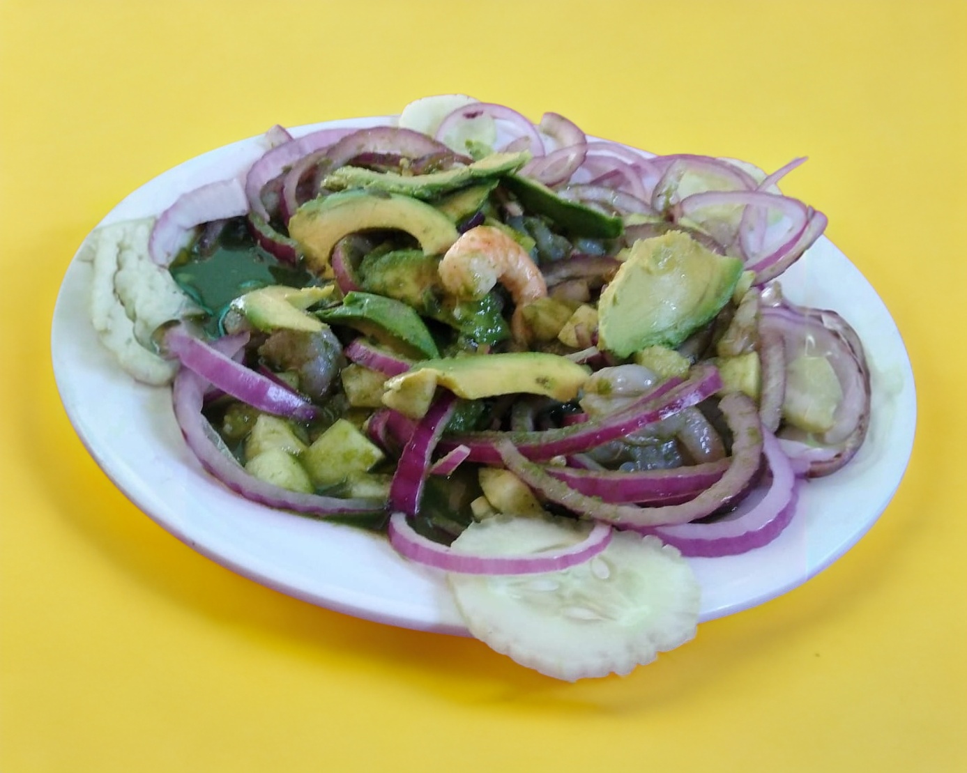 1/2 litro de aguachile a base de cilantro y chile verde, aguacate, cebolla morada, acompañado de 7 tostadas y 3 galletas.