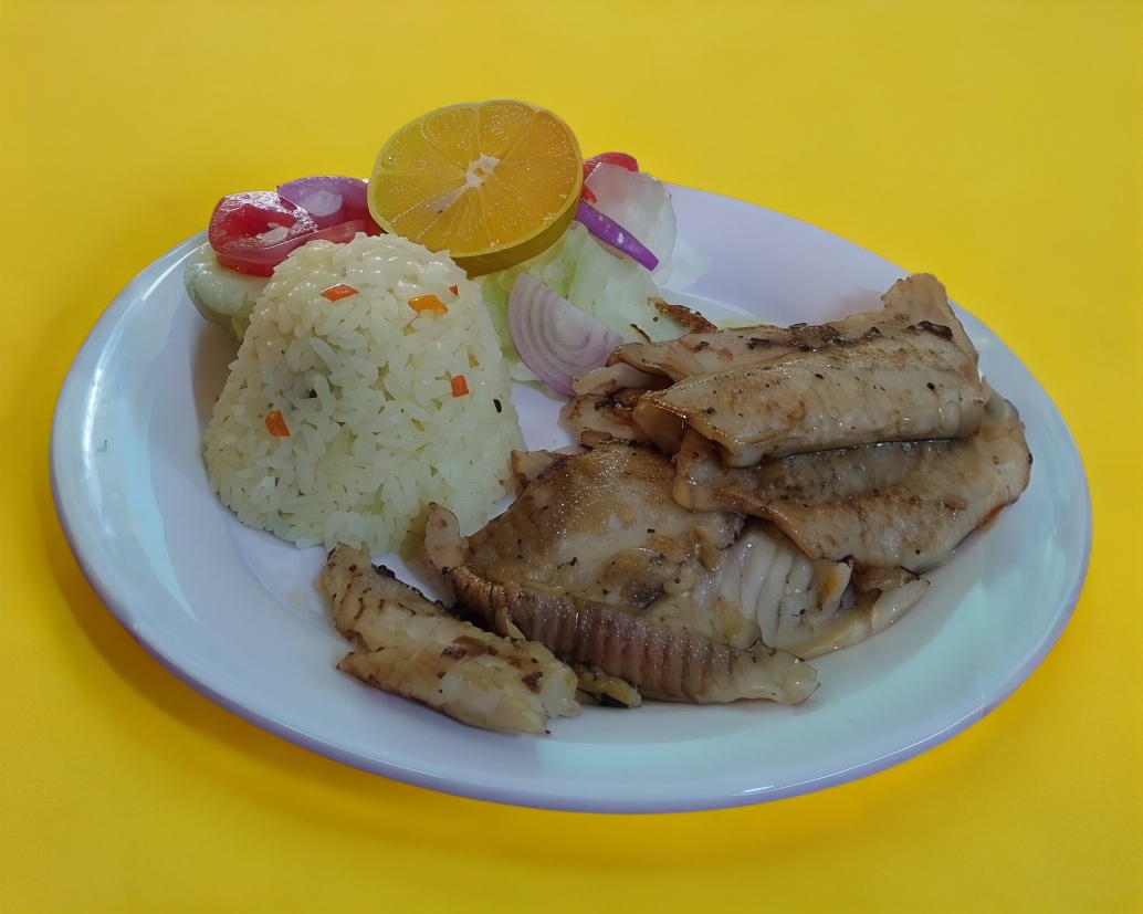 Filete de pescado (cazón) sazonado con ajo en aceite con un toque de salsa inglesa, acompañado de arroz blanco y ensalada fresca