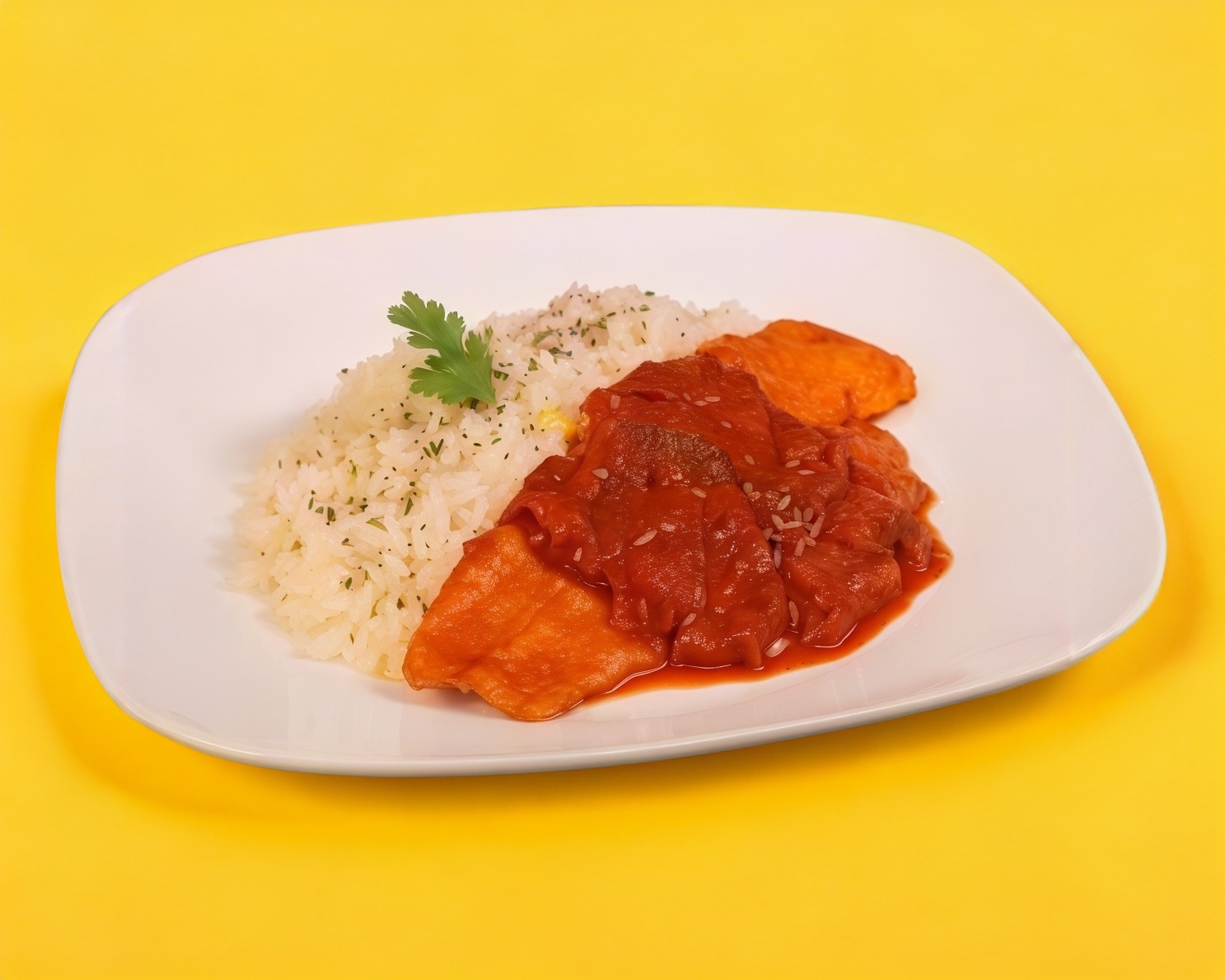 Delicioso Filete de pescado (cazón) bañado en salsa diabla acompañado de arroz blanco y ensalada fresca
