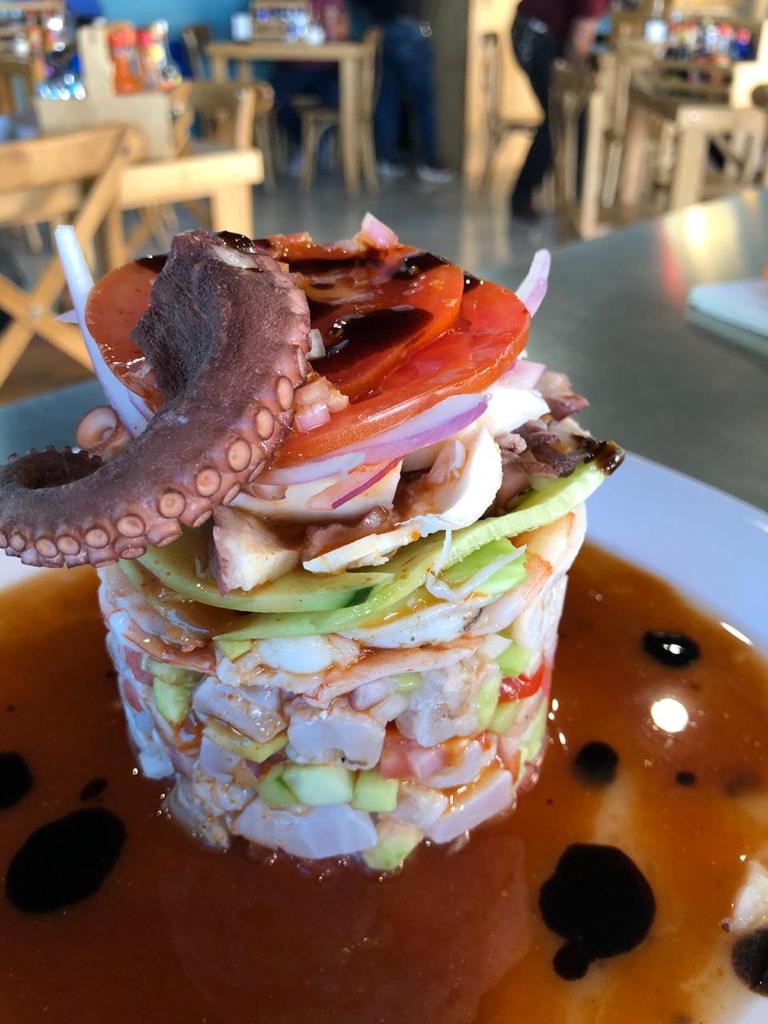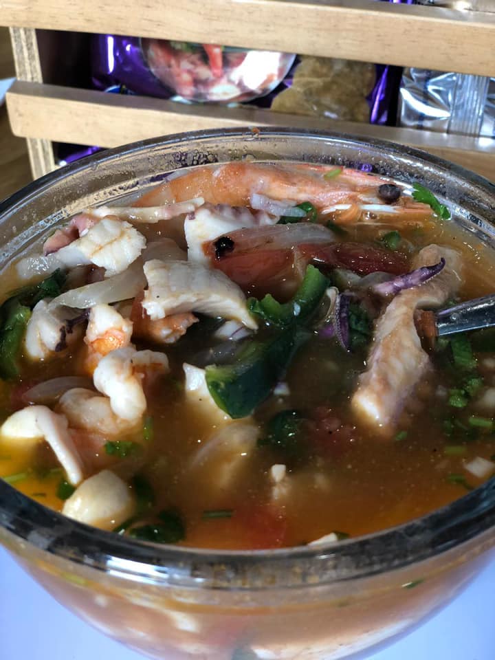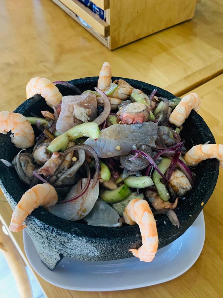 Ceviche de camarón, ceviche de pez, pulpo y camarón cocido.