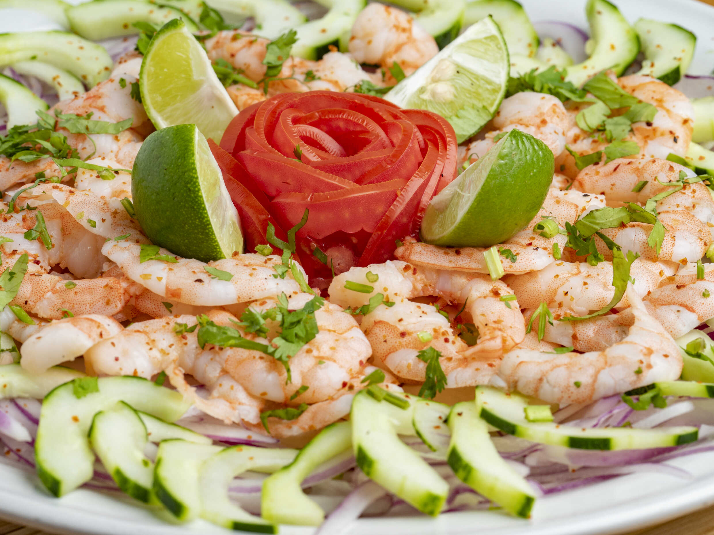 Camarón fileteado acompañado de jitomate y cebolla.
