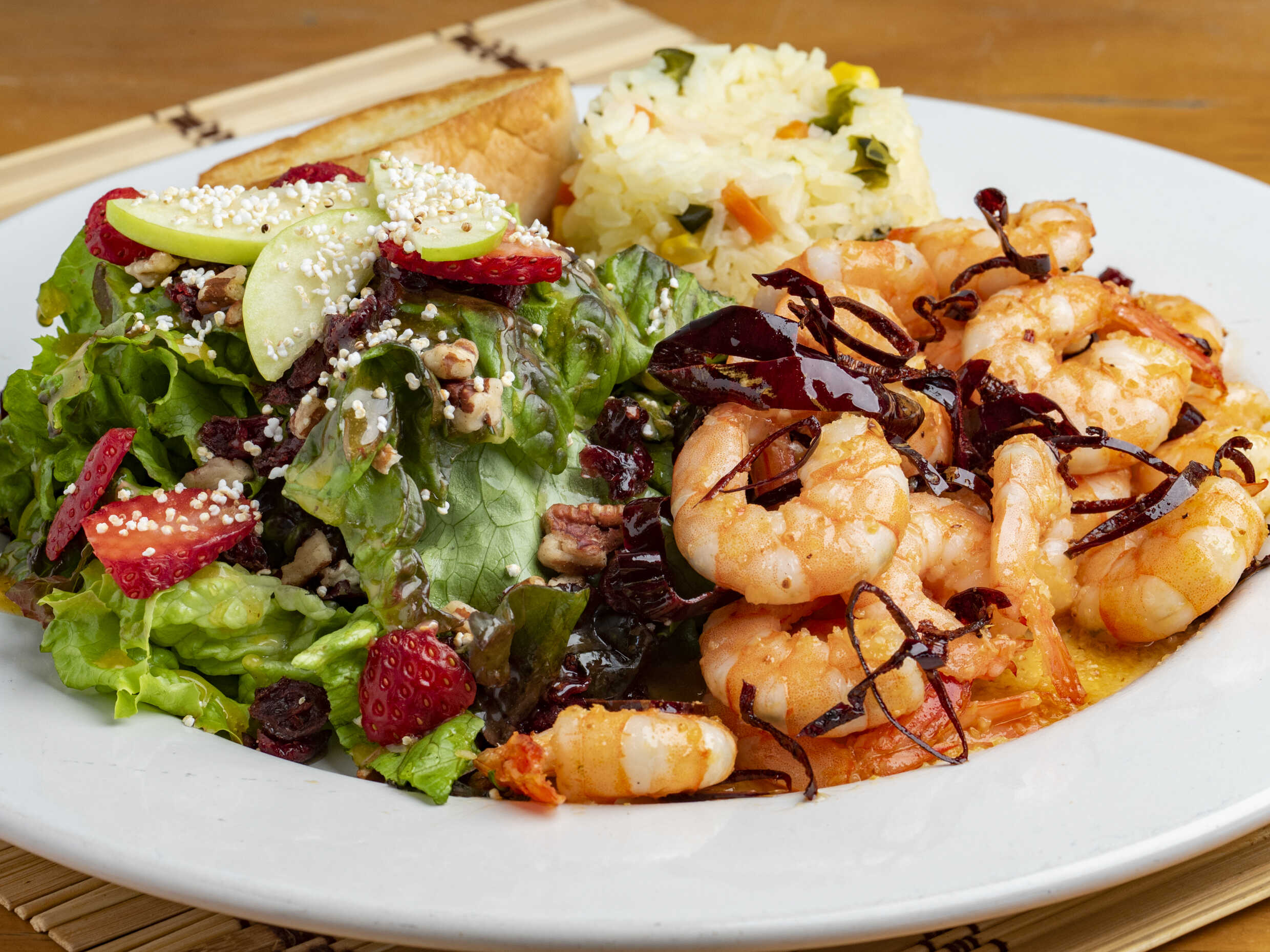 Camarón cocido con frutos tropicales en salsa de cítricos.