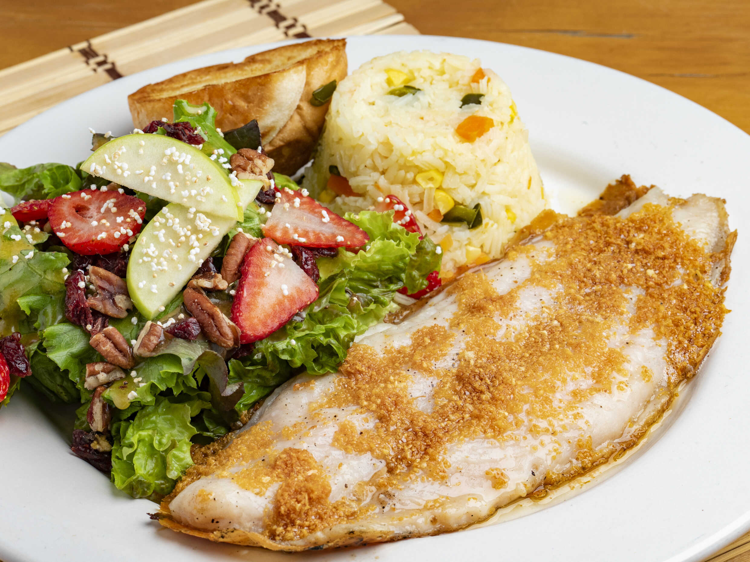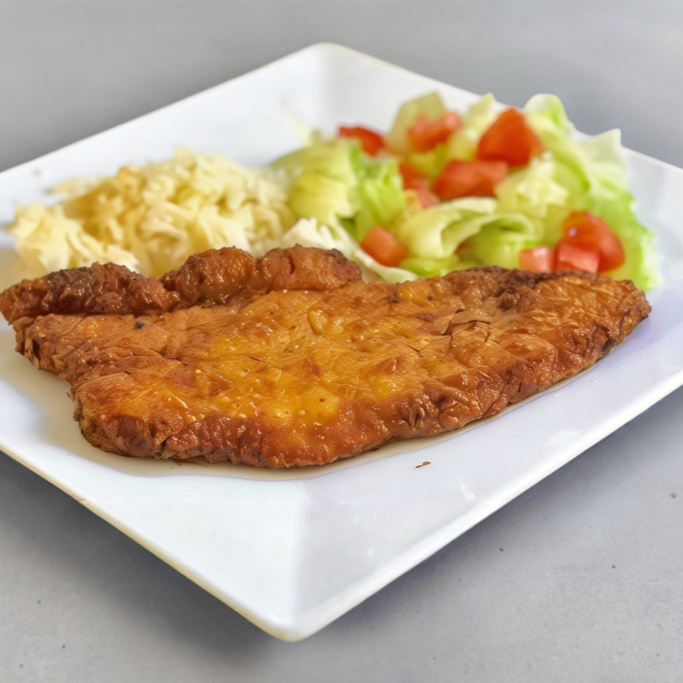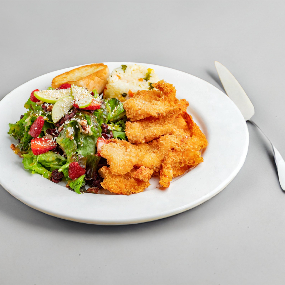 Filete de pescado empanizado, acompañado de arroz blanco y ensalada de la casa. (Porción personal)