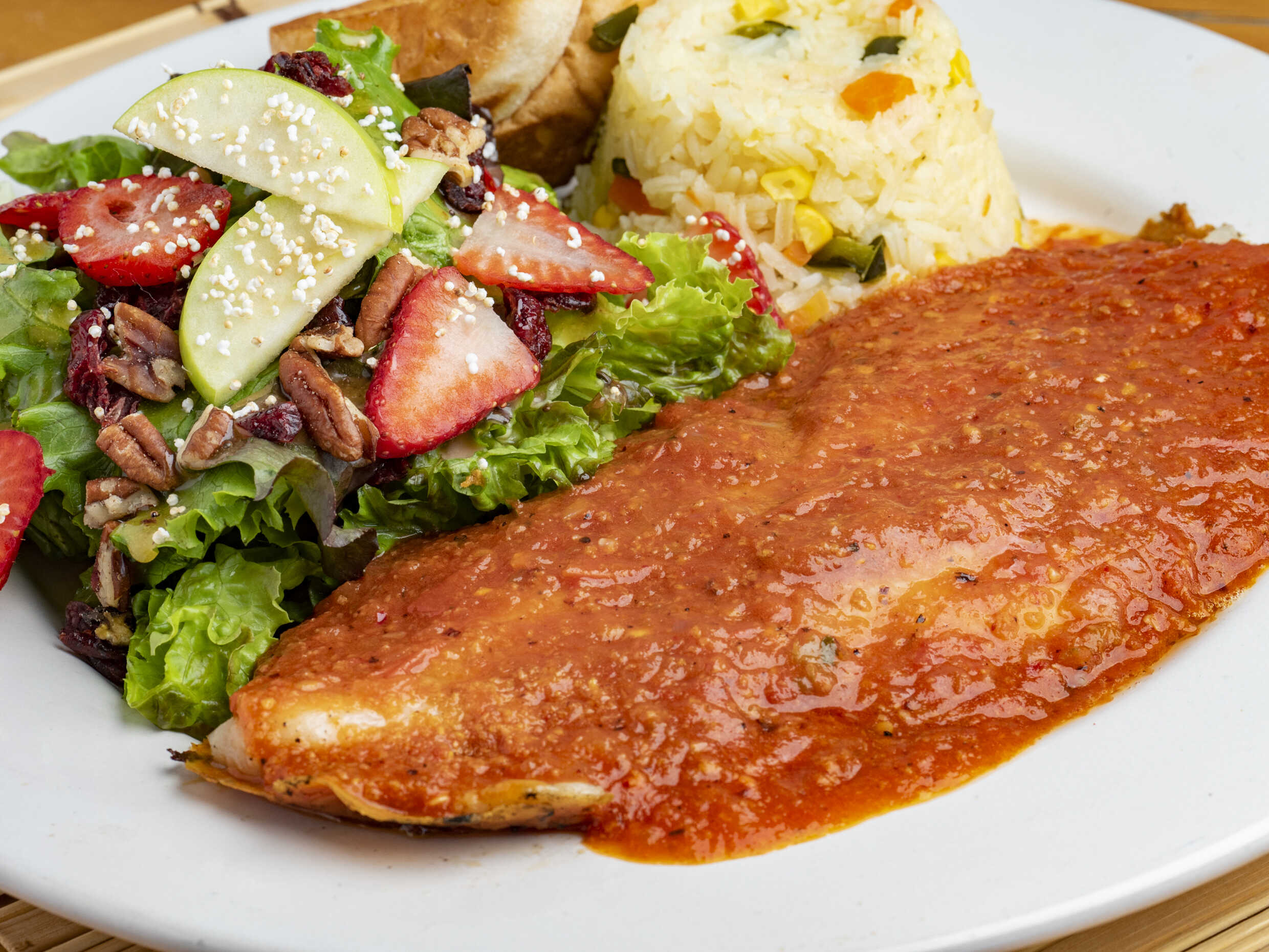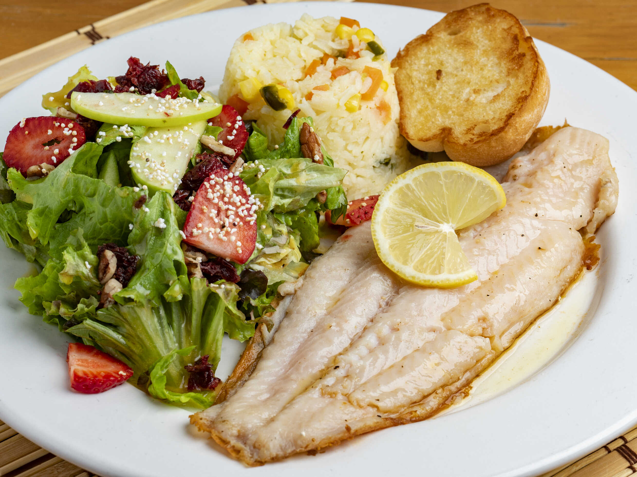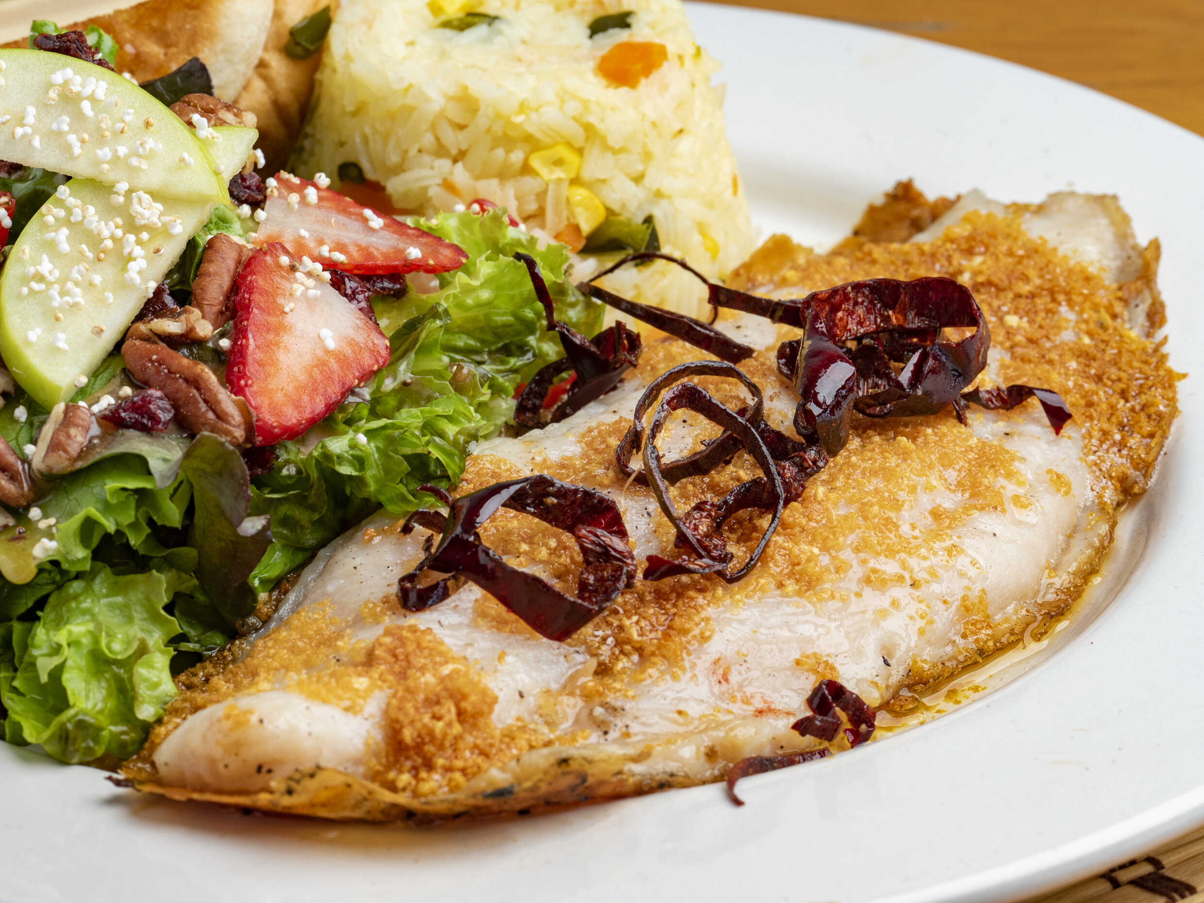 Filete de pescado empanizado, acompañado de arroz blanco y ensalada de la casa. (Porción personal)