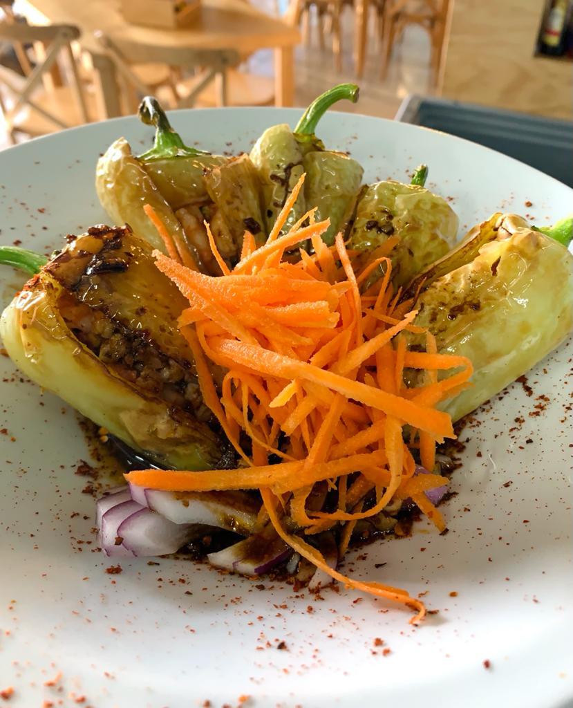 Chiles güeros rellenos de machaca de camarón, ahogados en salsa de la casa.