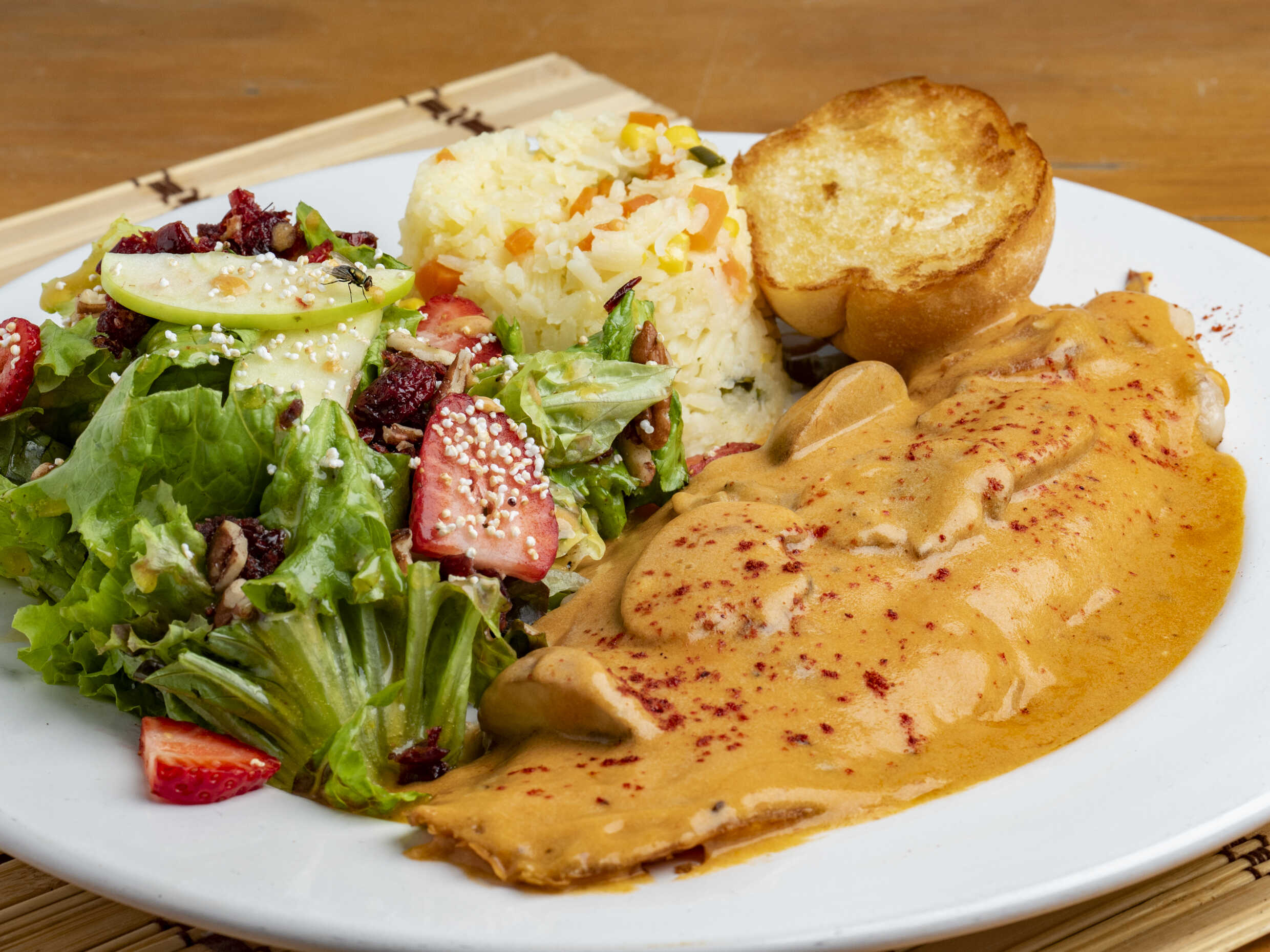 Filete en salsa cremosa de chipotle con champiñón.