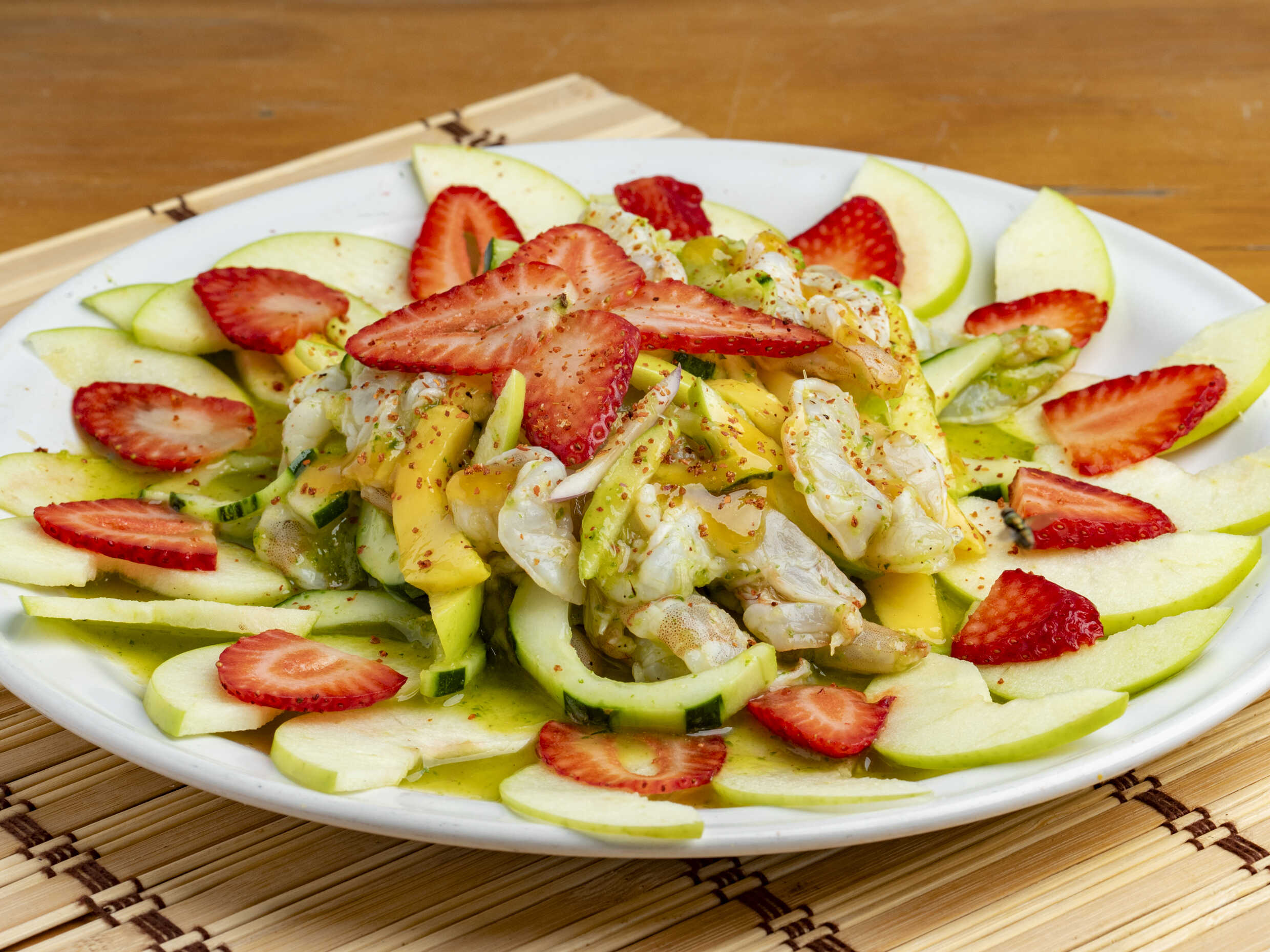 Combinacion de camaron cocido con atun y frutos tropicales