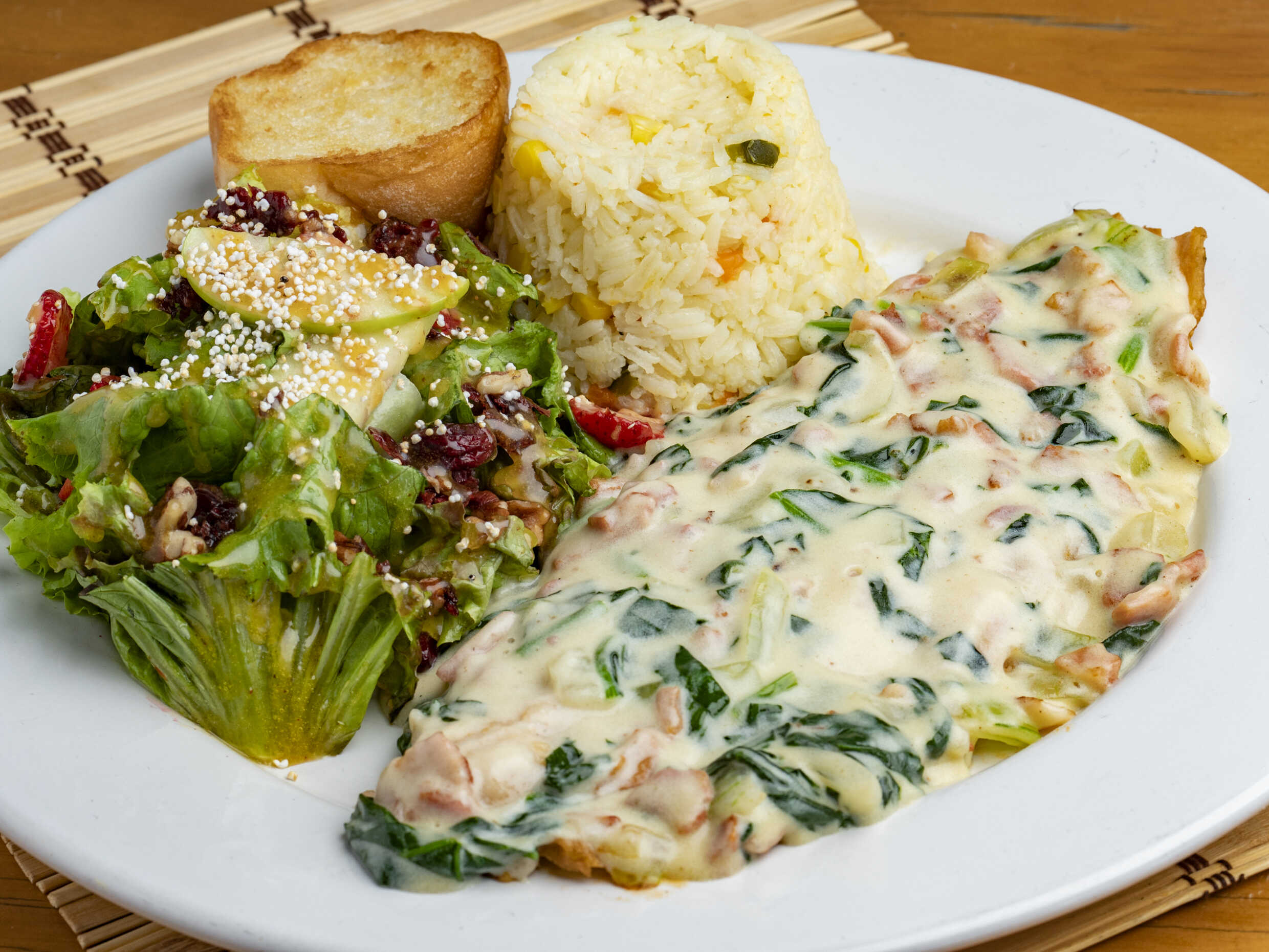 Filete en salsa cremosa con espinaca y tocino.