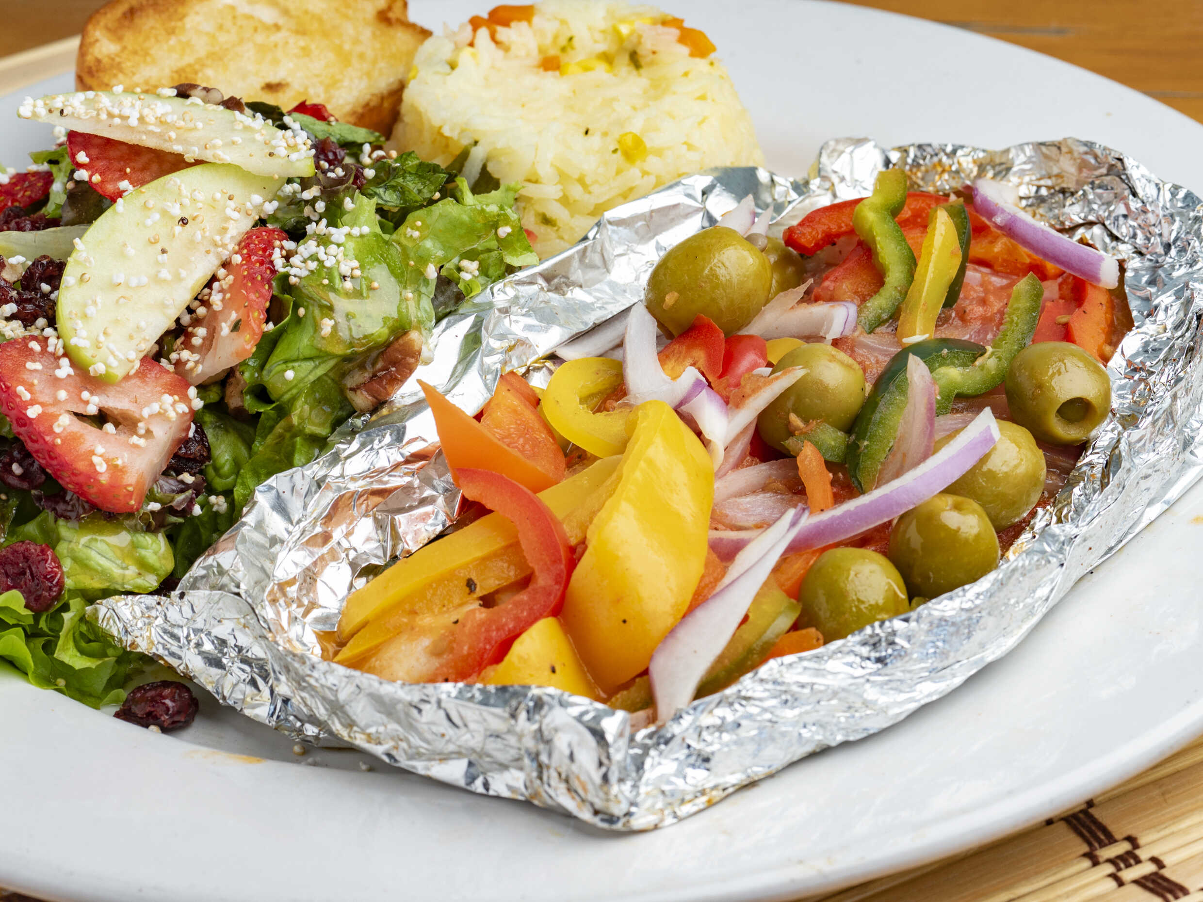 Filete empapelado con verduras y un toque de vino blanco.