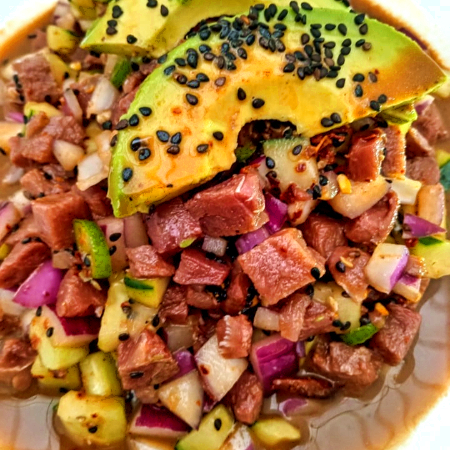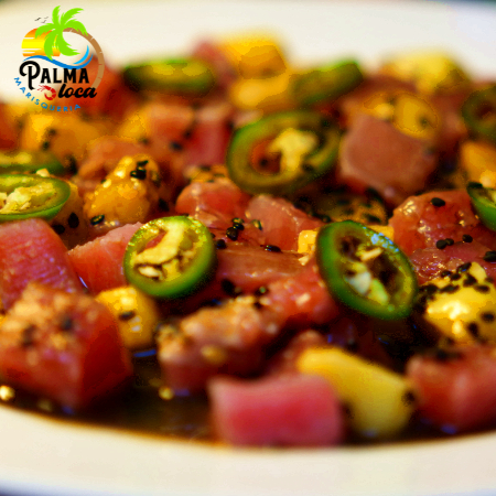 750 ml, Atun en cubos marinado en Aceite de ajonjoli, Mango, Cebolla morada, Pepino, Chile serrano, Salsa Negra especial de la casa