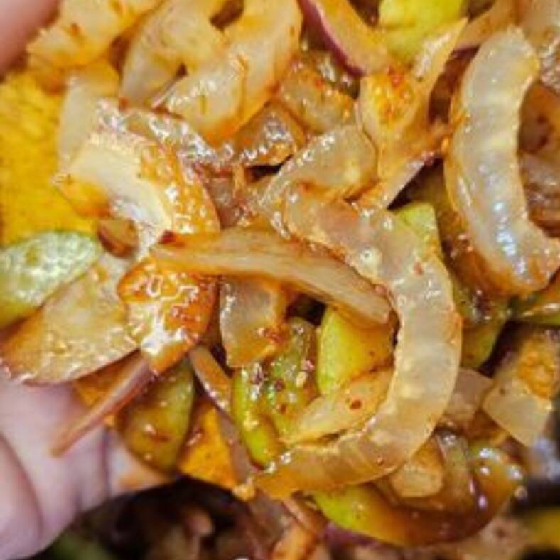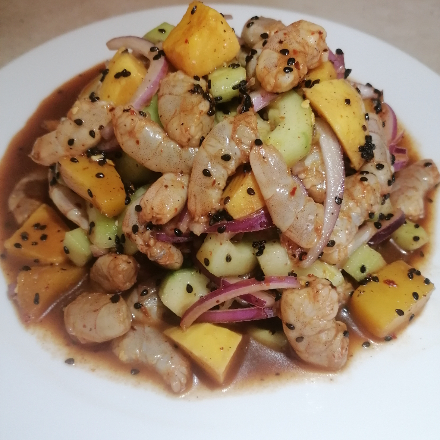 500ml, camarón curtido en limón, mango, pepino, cebolla morada, salsas negras de la casa.