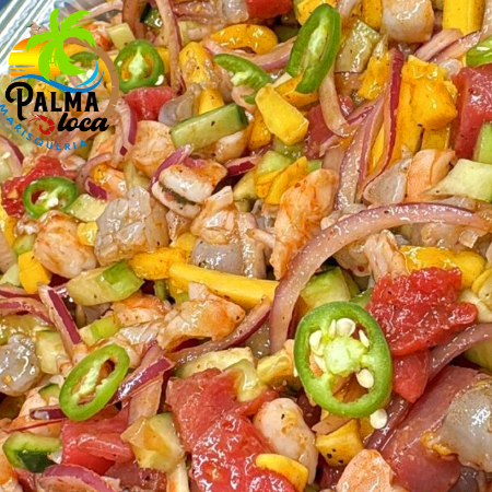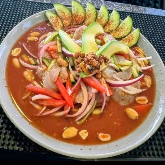 1 Litro, atun fresco en cubos, camarón curtido en limón, mango, pepino, cebolla morada, chile serrano, salsa especial de clamato picosita.