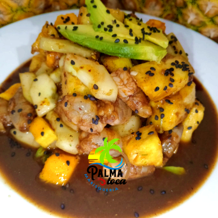 500 ml, camarón curtido en limón, piña, pepino, cebolla morada, salsas negras de la casa.